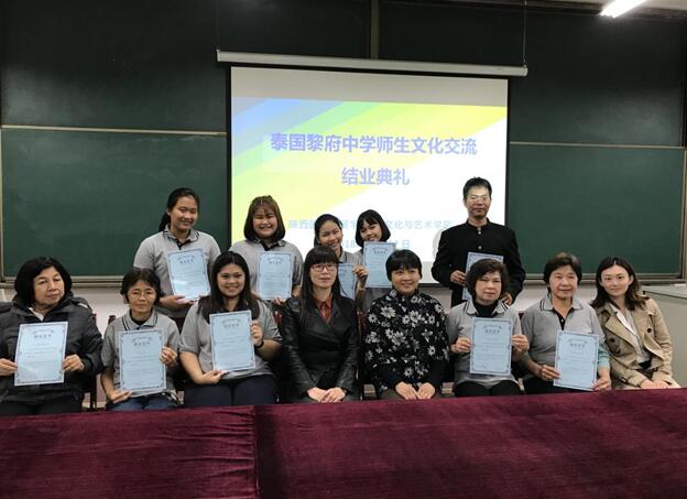 在泰国师生临行前,文化与艺术学院为他们准备了简短的结业典礼,文化与艺术学院党总支书记郭静与专业负责人杨炜老师为泰国师生颁发了结业证书。郭静表示欢迎泰国师生能够再次来到陕西国际商贸学院进行交流,也对活动的成功举办表示了由衷的祝贺。杨炜老师就汉语国际教育专业的国际化发展提出了与泰国院校继续合作的愿望,希望通过活动促进中泰两国文化友好交流。最后汉语国际教育专业的学生向泰国师生们赠送了礼品,表达了对泰国师生的依依不舍之情。