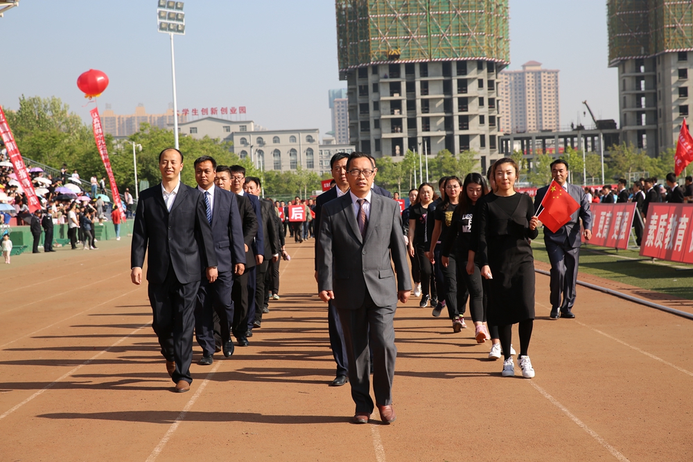 本网讯 (党委工作部 记者团)4月19日早8:30分,校党委书记、督导专员赵军政宣布我校第十一届田径运动会开幕式正式开始。序幕打开的那一刻,我们不仅看到了出席开幕式的各位嘉宾和全校师生,我们还看到了新时代腾飞的商院的新面貌、新精神和新梦想。开幕式,打开了商院人内心能量的闸门,召唤着全体师生拼搏奋进,也为商院争创一流加油助威。