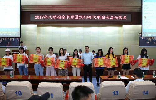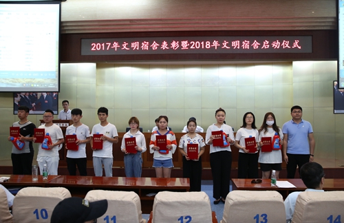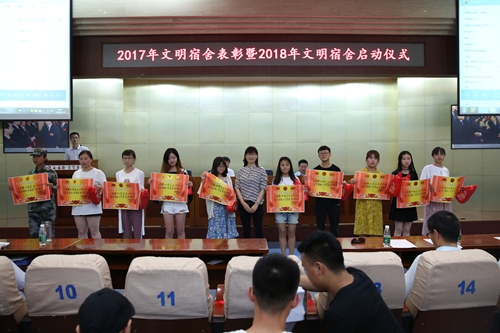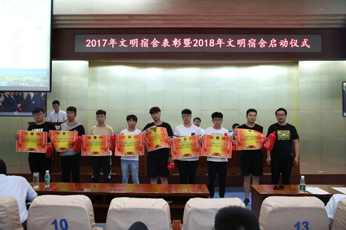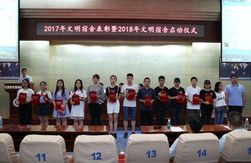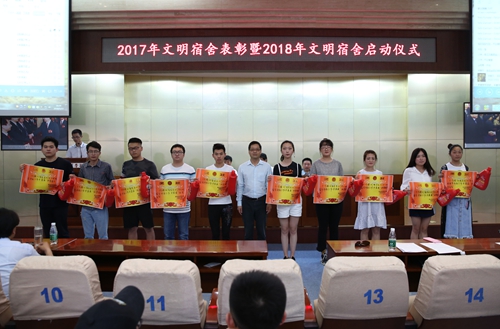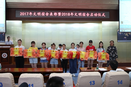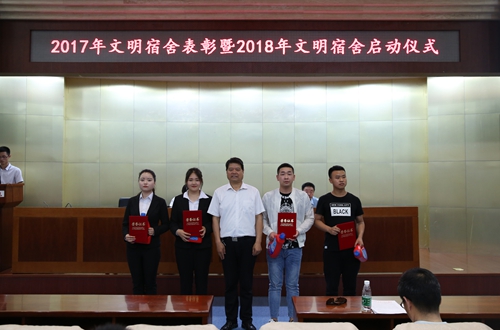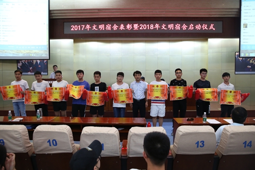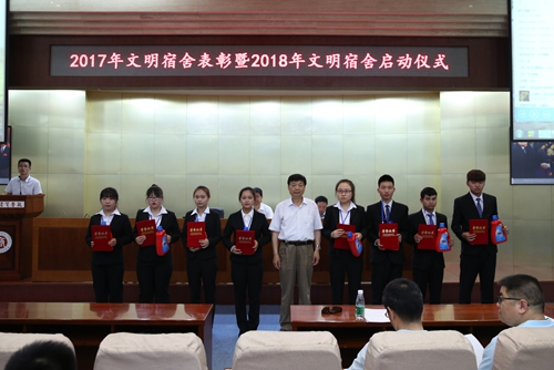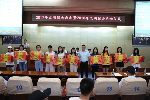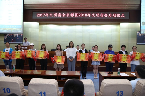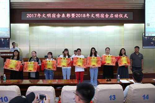 会上,党委副书记、副院长徐唯诚宣读了学校2017年度获评“文明宿舍的表彰决定”名单,与会领导及有关部门负责人、各学院党总支书记分别为受表彰的100个文明宿舍以及62名优秀楼长、层长和公管会干部学生等颁奖。