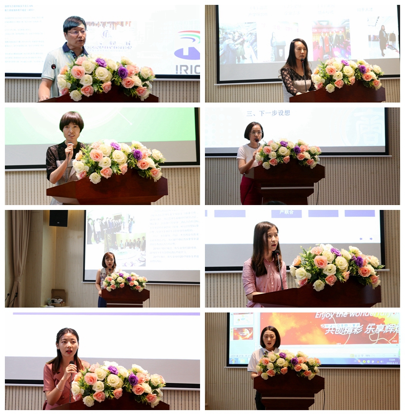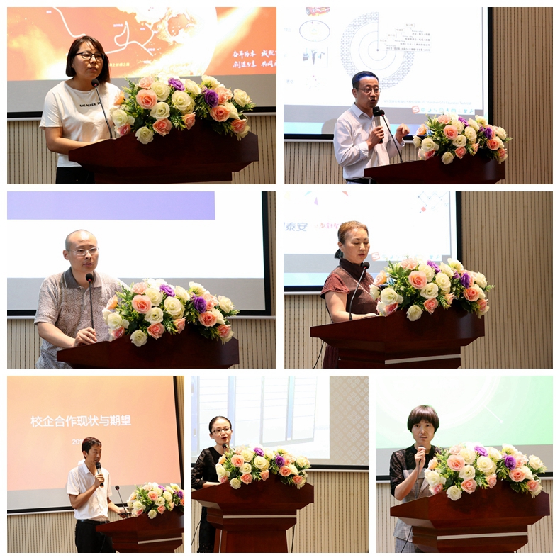 信息与工程学院胡翮院长,中软国际有限公司校企合作部总经理闫军霞,中软国际班学生代表、计信1601班学生卫蕊;文化与艺术学院学前教育系系主任薛媛,国泰安教育集团营销中心执行总经理邱进毅,西安行知集团富锦佳苑幼儿园园长田园;珠宝学院宝石教研室主任安梅,众高珠宝零售管理(西安)有限公司教育培训总监胡国庆、宝石及材料工艺学B1401班在企业实习学生代表王丹;财务与会计学院酒店管理系系主任王聪、西安豪享来温德姆至尊酒店培训经理王转转;国际经济学院企业代表——京东物流西北分公司人力资源部经理白光泽,时装与艺术学院院长曲梅,医药学院企业代表——步长制药有限公司工艺工程部经理、医药学院副院长郑伶俐依次发言交流。