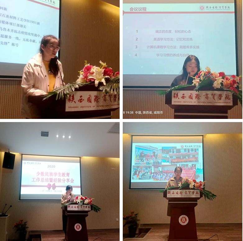 本次活动遴选了四位优秀少数民族学生分别围绕抗击疫情、志愿服务、学习典范、社团活动等方面进行了分享交流。珠宝学院苏楠景(回族)同学以“抗疫有我 隔离不隔爱”为题分享了她在2020年乌鲁木齐抗击疫情攻坚战中,积极投身疫情防控志愿服务一线,无私奉献,表现突出,荣获“抗疫先锋”称号的先进事迹;管理学院沙晓莲(回族)同学,分享她“志愿同心 爱使我行”积极加入青年志愿者行列,让爱洒满人间的志愿者经历;文学与教育学院冶明珠(回族)同学,以“励志我先行,疆来必有你”为题分享了她大学三年两次获得国家励志奖学金的学习“秘籍”;医药学院沙雅·阿合买提(哈萨克族)同学,分享了她“我的社团我的团”社团活动组织的成功实践经验。