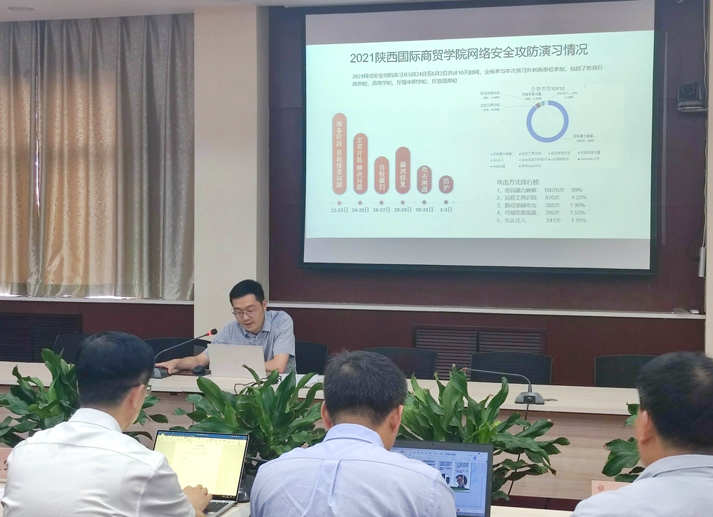 会上,信息化中心副主任杜军伟从我校护网行动部署、防守情况、黑客攻击路线溯源、本次演习暴露出的弱点及学习到的经验等五个方面汇报了我校本次网络安全攻防演习的总体情况。