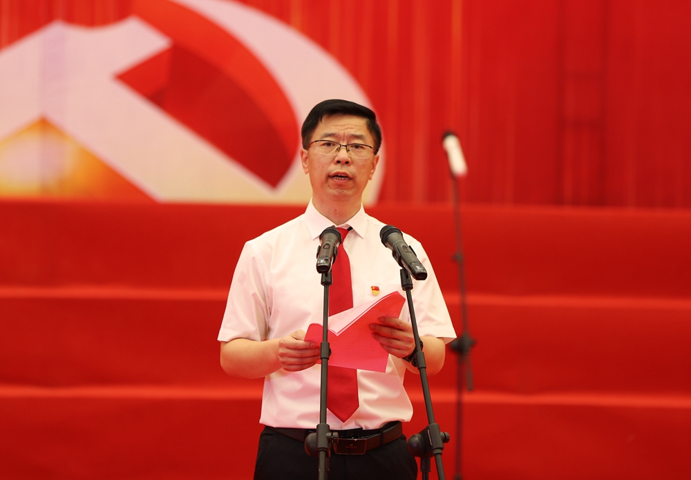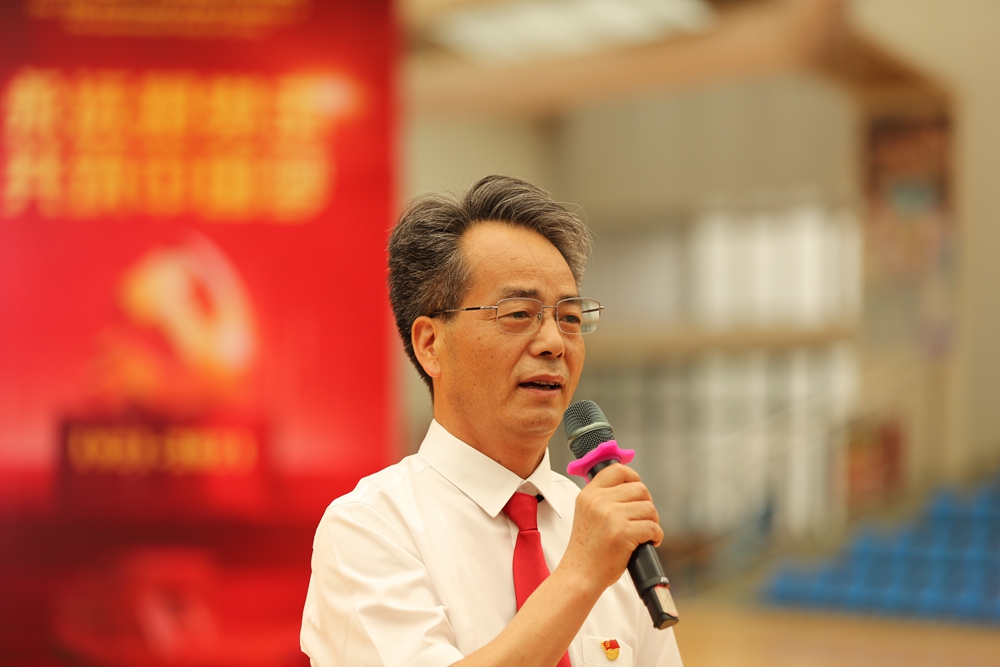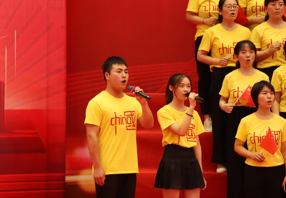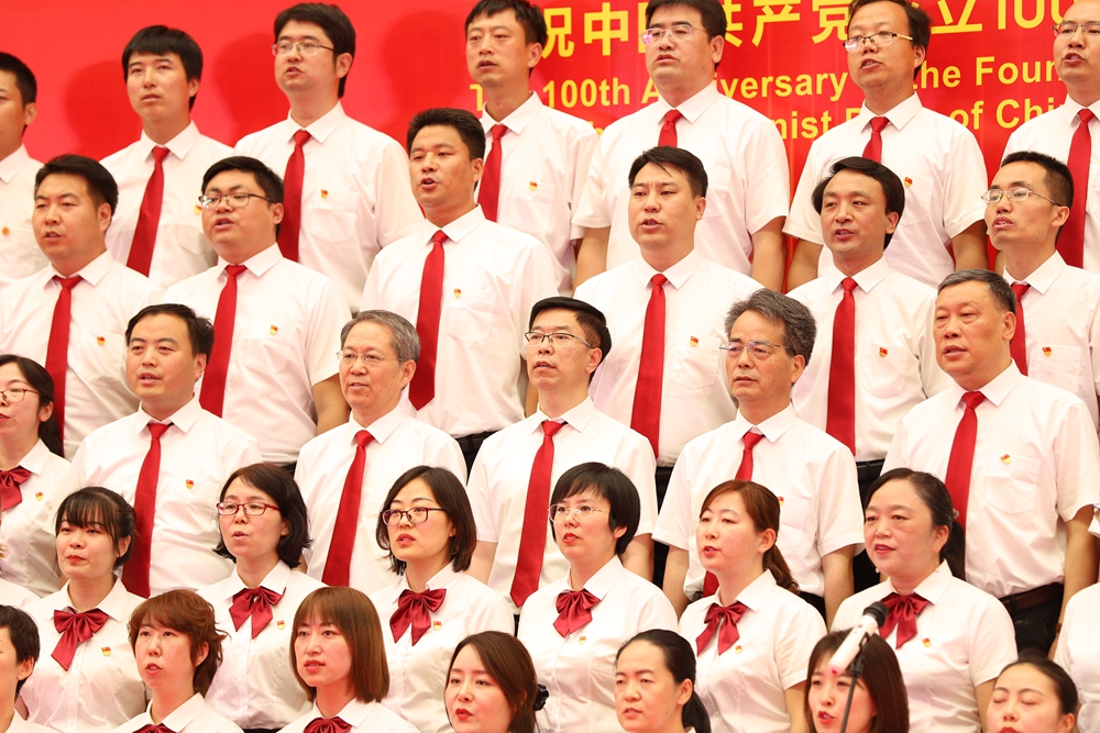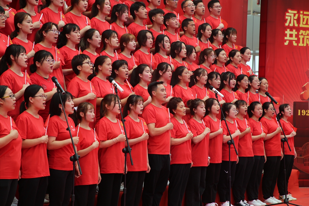 校领导参与的机关表演队合唱的一曲《没有共产党就没有新中国》,真挚的歌声,昂扬的旋律中同庆中国共产党百年华诞。