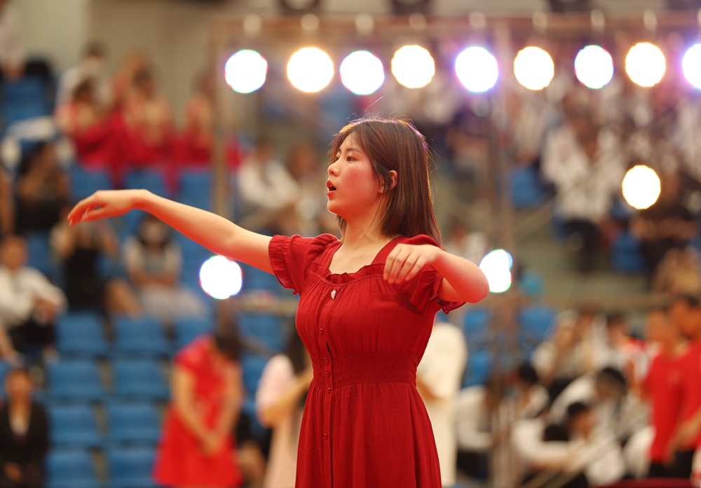 国际经济学院参赛队首先登台演唱,在他们整齐统一的表演服上大大的印刻着“中国”的字样,洋溢出了他们的爱国主义的热情,他们表演的《中国、中国,鲜红的太阳永不落》《商院赞歌》,表达了他们对中国蒸蒸日上、欣欣向荣的景象的无限热爱,唱出了他们向着实现学校百年奋斗目标笃定前行的雄伟气魄。