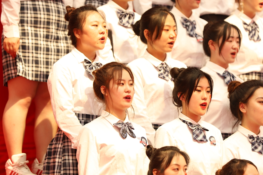 高职学院参赛队表演的《今天是你的生日》《商院赞歌》以一种亲切自然的态度表达了对祖国母亲的深情祝福。