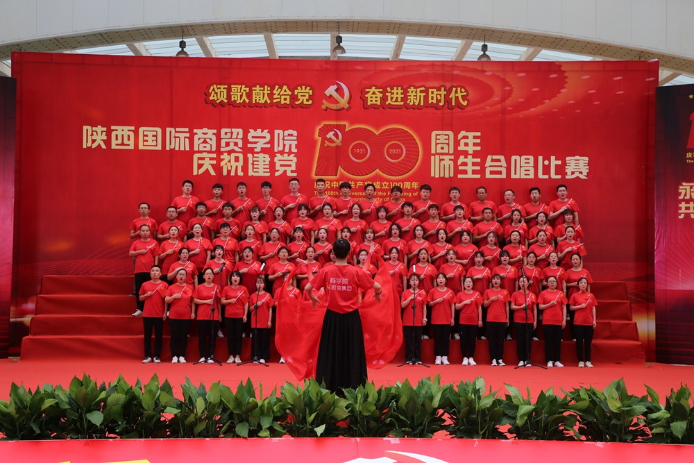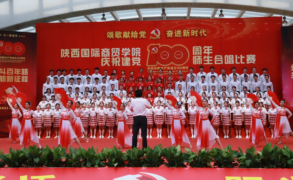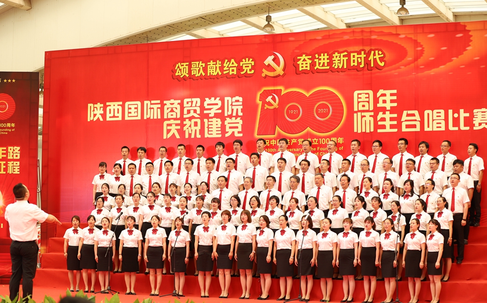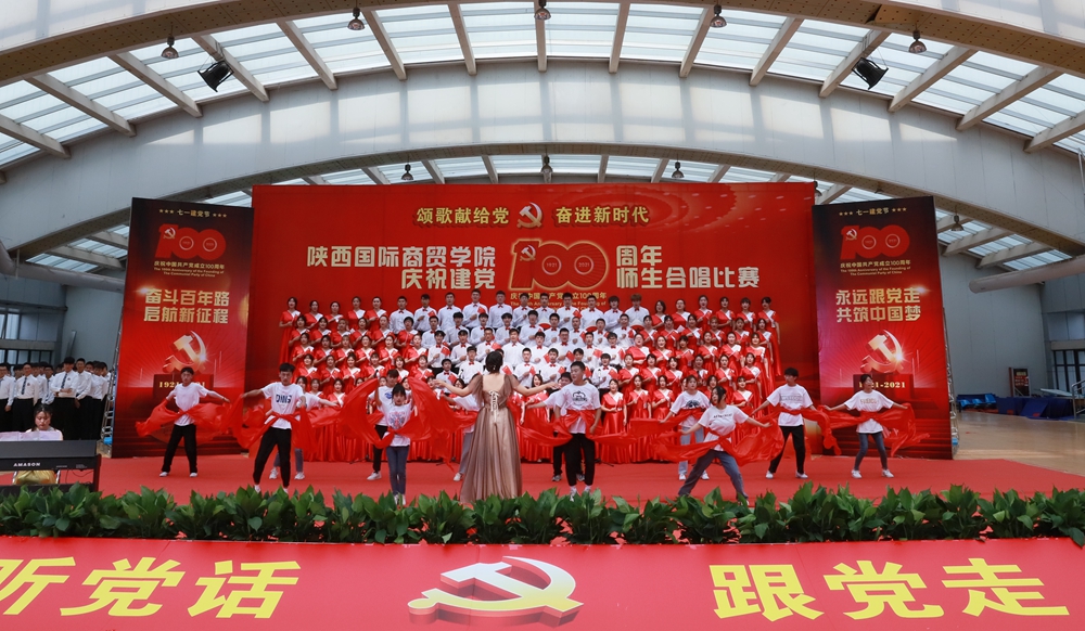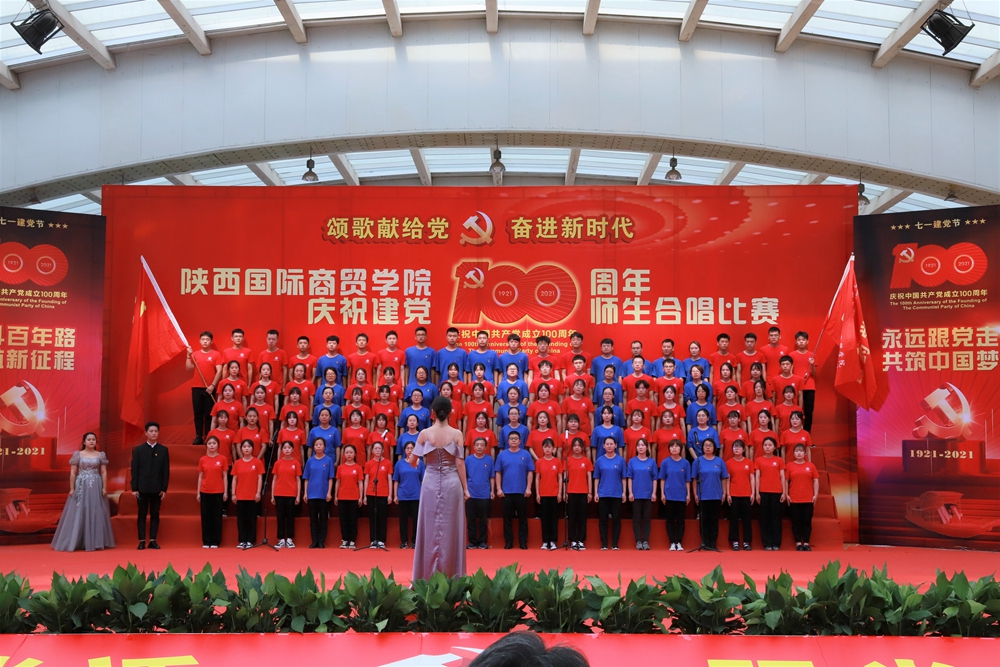 本网讯:为庆祝中国共产党成立100周年,深入开展党史学习教育,6月25日下午,陕西国际商贸学院庆祝建党100周年师生合唱比赛隆重举行。校长张辉,党委书记、督导专员康亚国,常务副校长贾明远,副校长甘世平,副校长李吉友和1400余名师生同台演出,深情表达爱党爱国爱校之情。