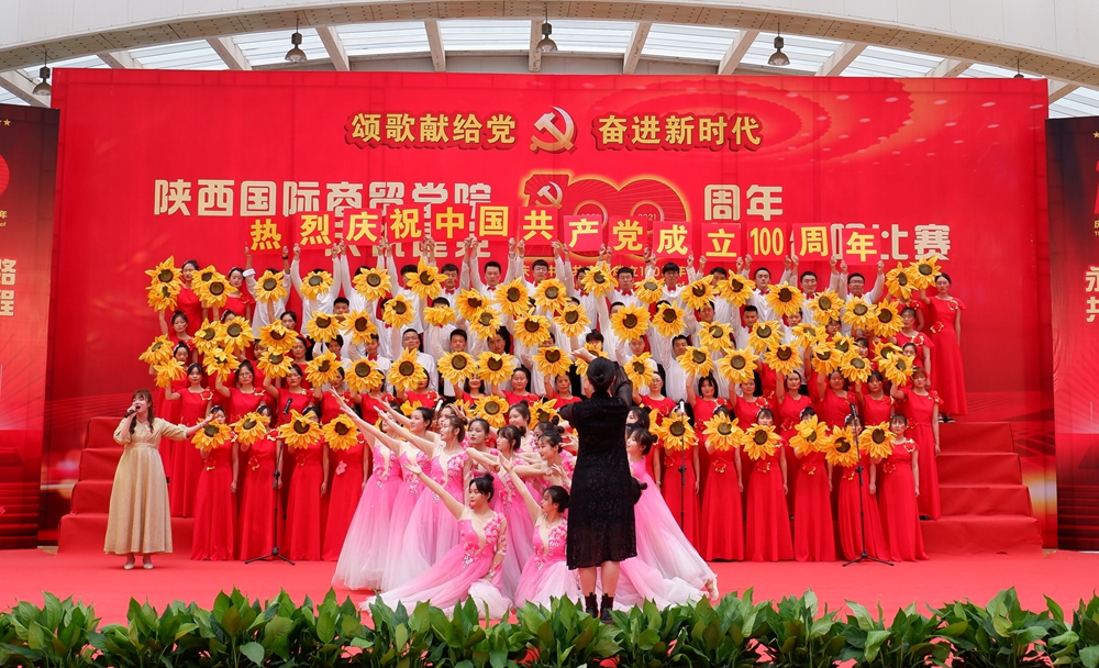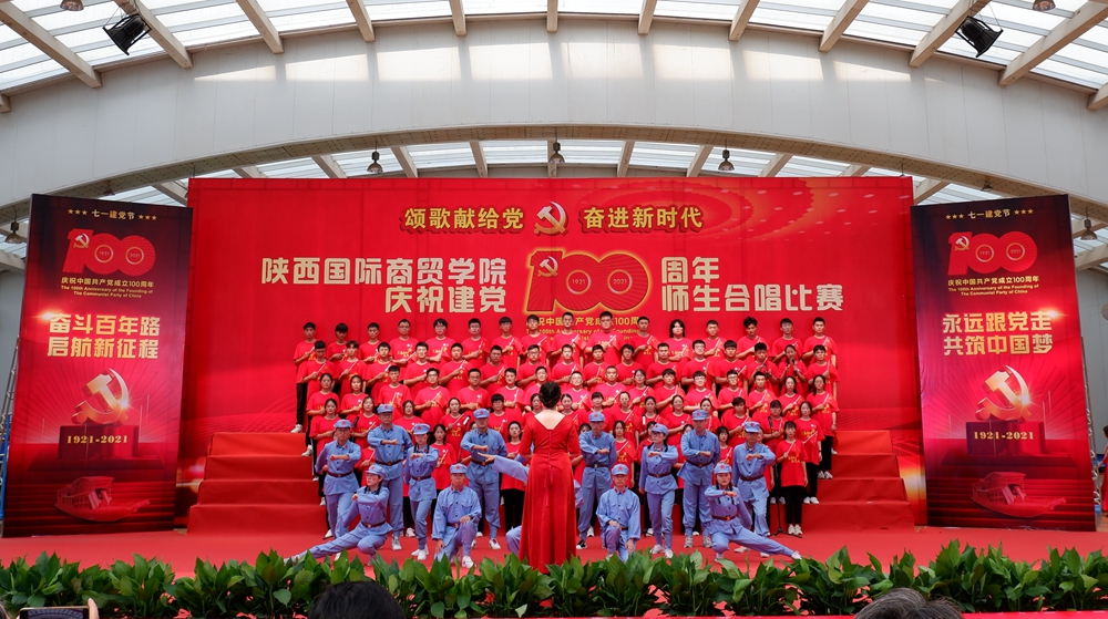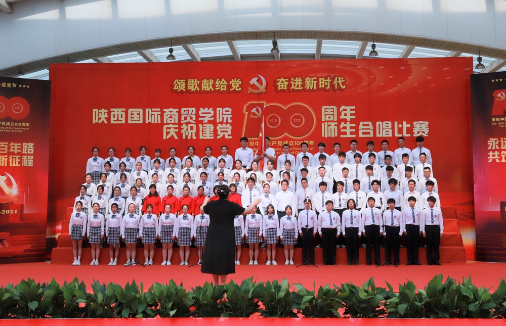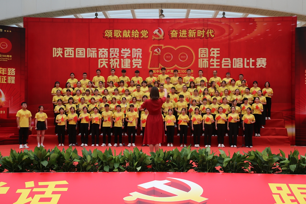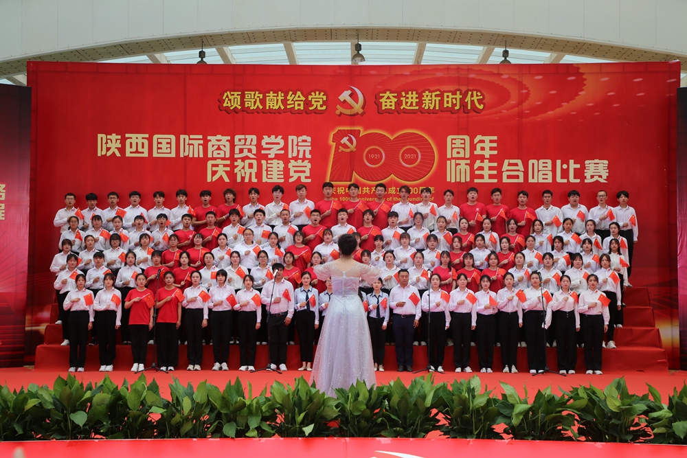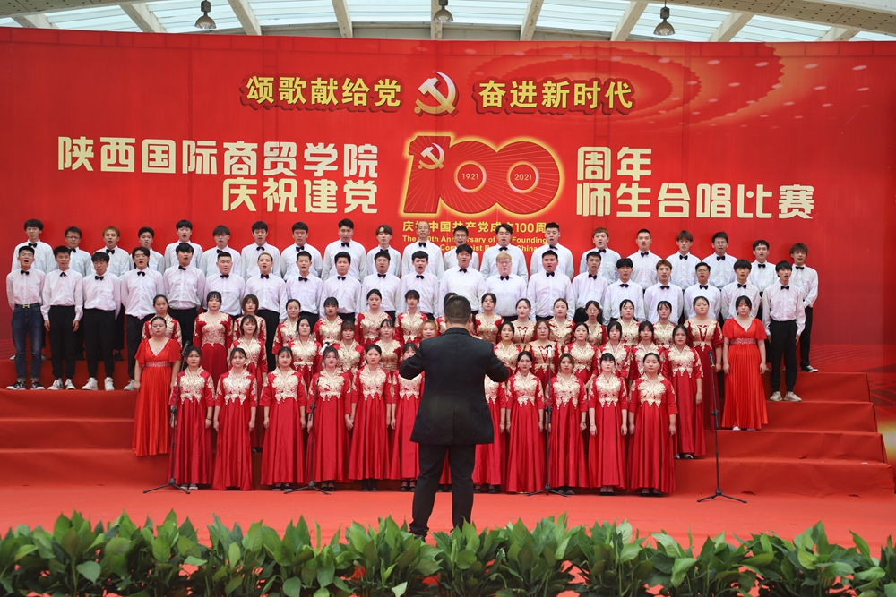 本网讯:为庆祝中国共产党成立100周年,深入开展党史学习教育,6月25日下午,陕西国际商贸学院庆祝建党100周年师生合唱比赛隆重举行。校长张辉,党委书记、督导专员康亚国,常务副校长贾明远,副校长甘世平,副校长李吉友和1400余名师生同台演出,深情表达爱党爱国爱校之情。
