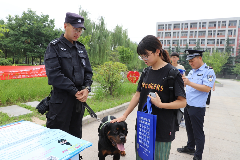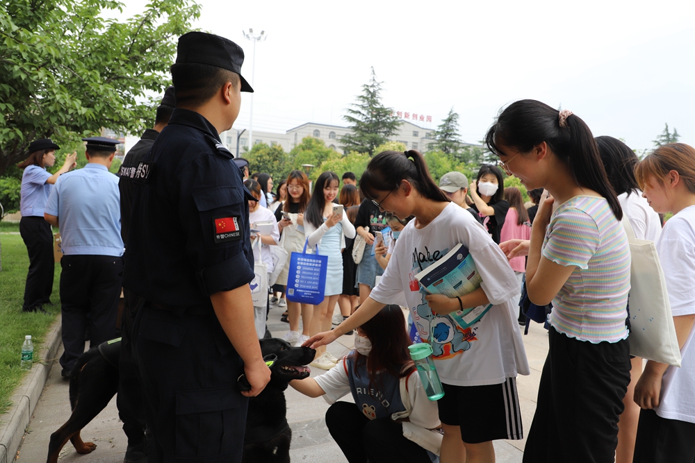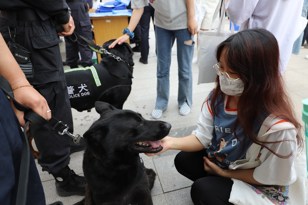 除此之外,两只憨态可掬的警犬更是吸引了学生们驻足观看,且乐此不疲与“警犬”合影留念。路过的学生表示,“平常看到警犬是在电视上,没想到今天看到了真的,而且它看起来并不是很凶猛其实很萌很听话,特警队员让它坐下,它就真乖乖坐下了。”