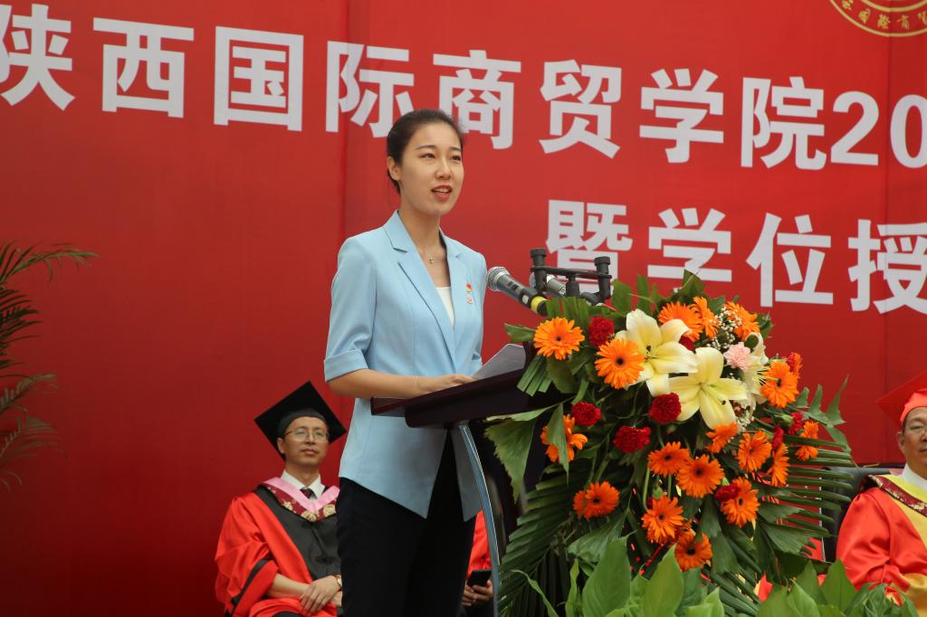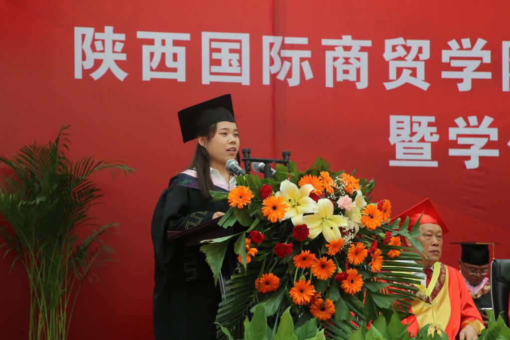 文学与教育学院杨思嘉作为教师代表祝同学们毕业快乐,四年学习生活中的辛酸苦辣,在回首之时,将会变为你们成长道路中的宝贵财富,也会伴随你们在以后的道路上走得更远、飞得更高;管理学院市场营销B1704班的杜豆霞作为毕业生代表首先表示感谢商院四年的培养与教育,毕业后,将会带着母校的嘱托和寄语,朝着自己的目标努力,争当新时代的优秀青年;2005届计算机应用专业毕业生杨黄龙作为校友代表也共同见证了学弟学妹们这一重要时刻,希望大家能够以史为鉴、开创未来;携手并进,加强沟通;增进友谊,创造更加辉煌的明天。