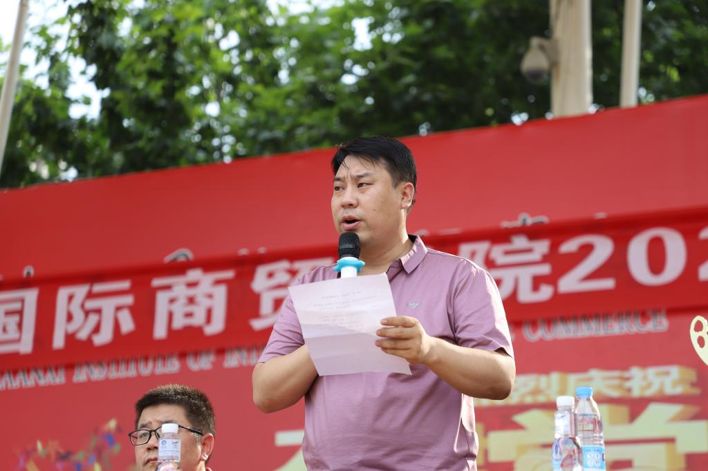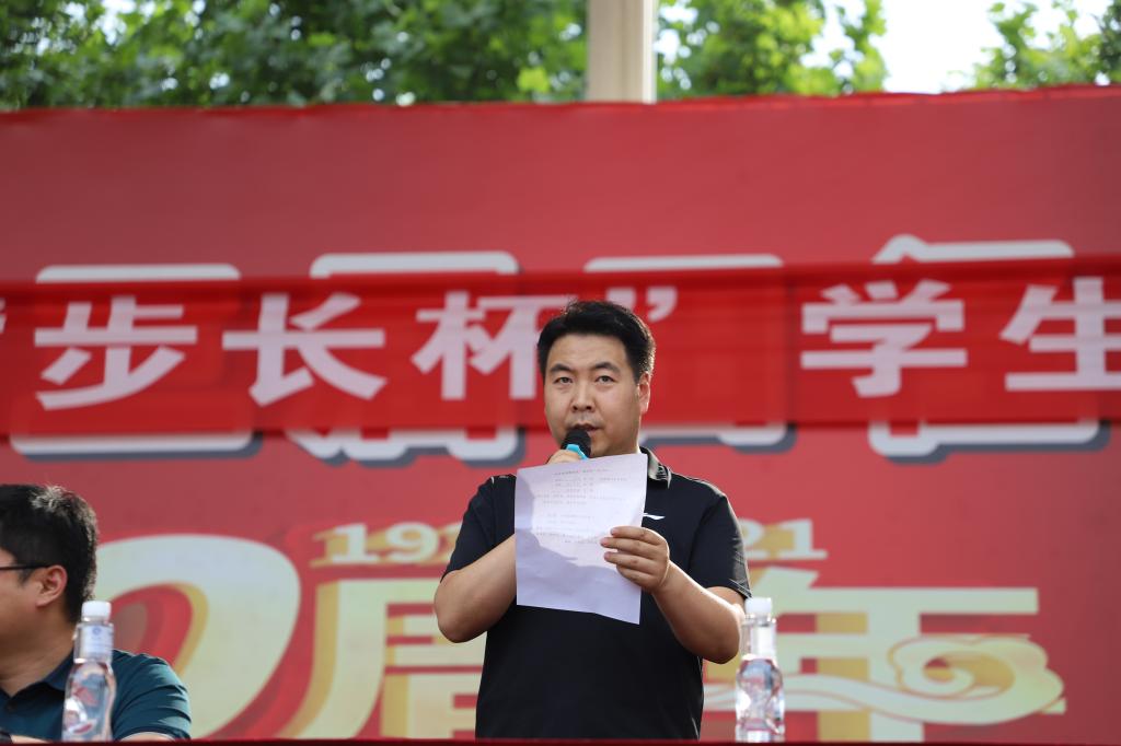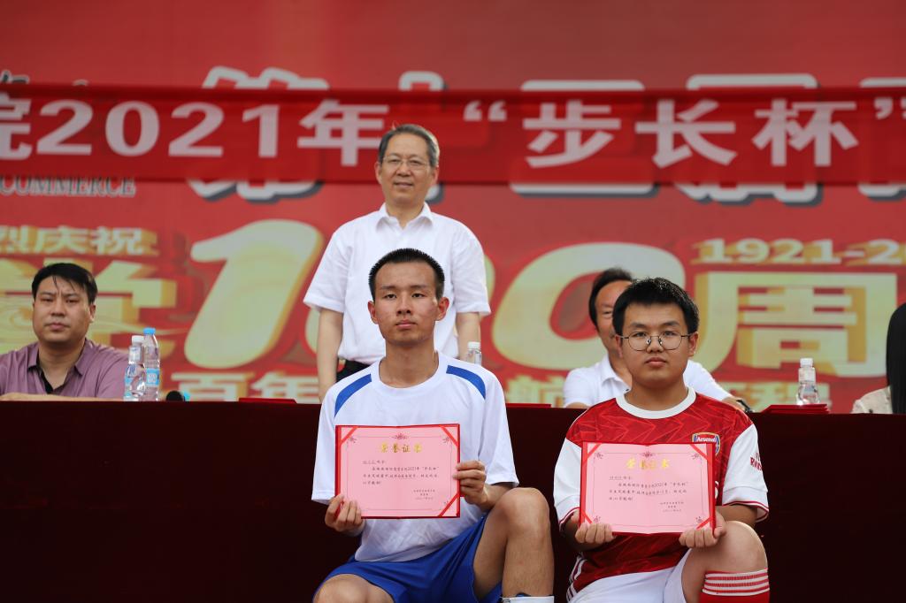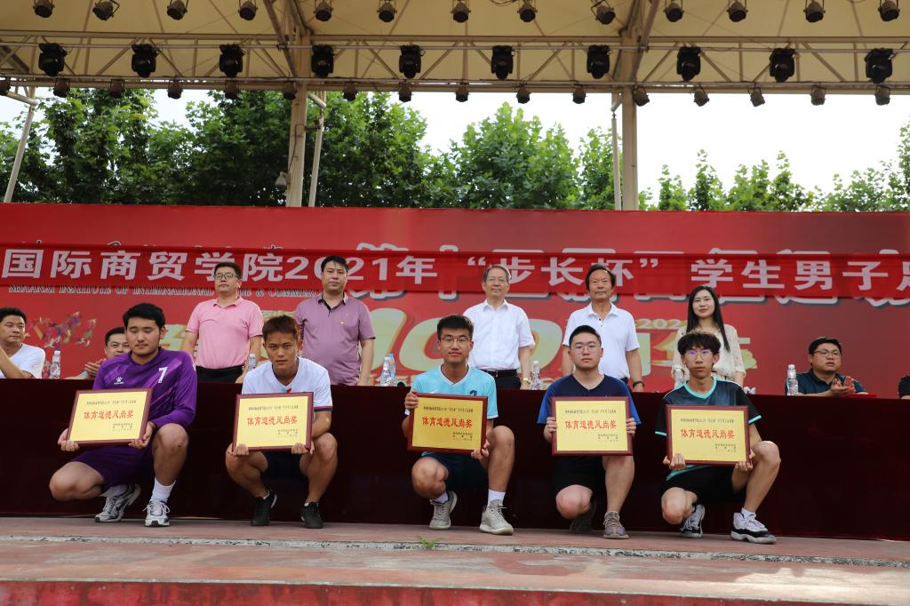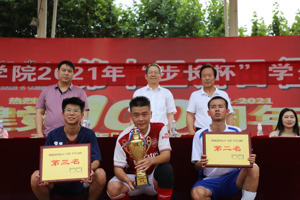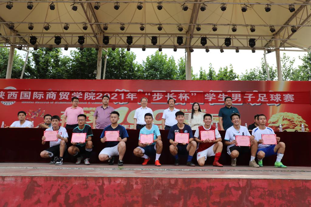 本网讯:为了进一步开展好校园足球活动。我校于6月15日至6月30日成功举办了2021年“步长杯”学生男子足球赛。全校共有8个二级学院代表队参赛。比赛中各代表队敢打敢拼,顽强拼搏,展现了商贸学院学生积极向上、努力奋进的体育精神。本次足球赛经过15天10场的激烈角逐,于6月30日下午落下帷幕并成功举行颁奖仪式,常务副校长,党委副书记,纪委书记贾明远出席,为获奖代表队颁奖并讲话。