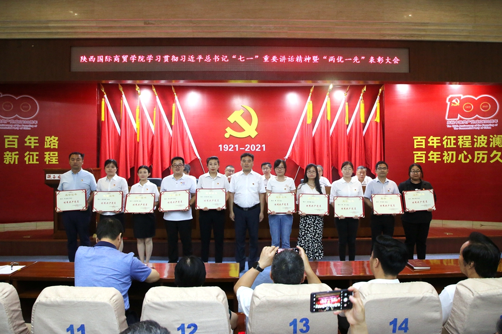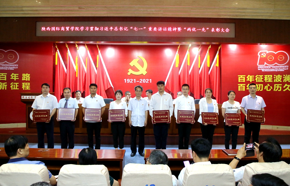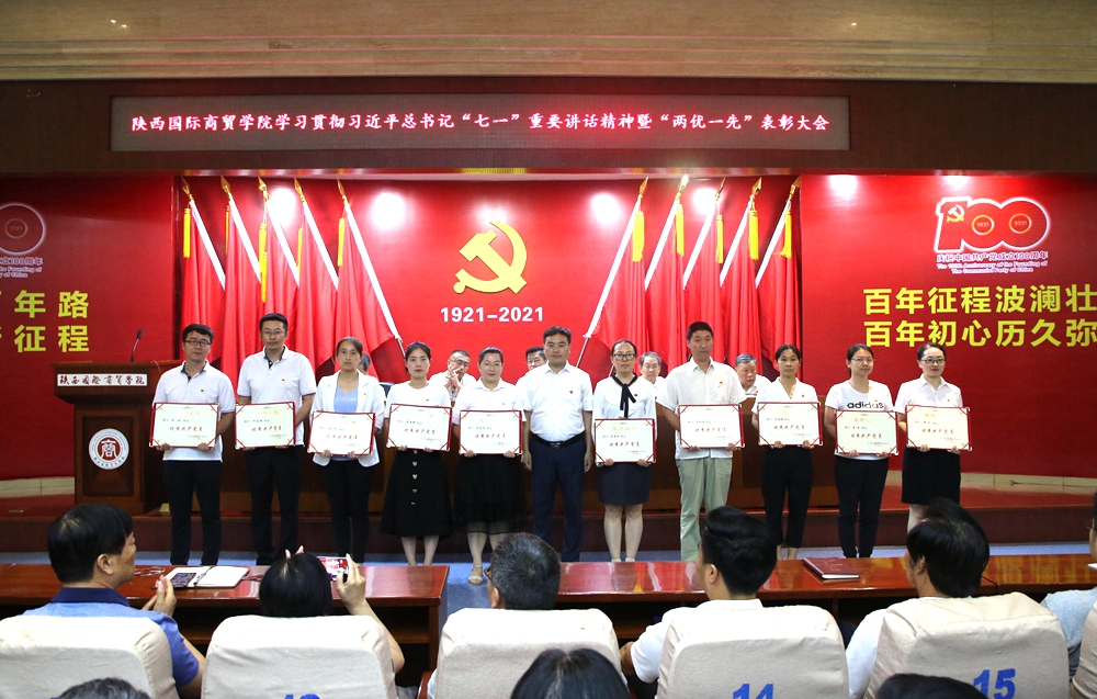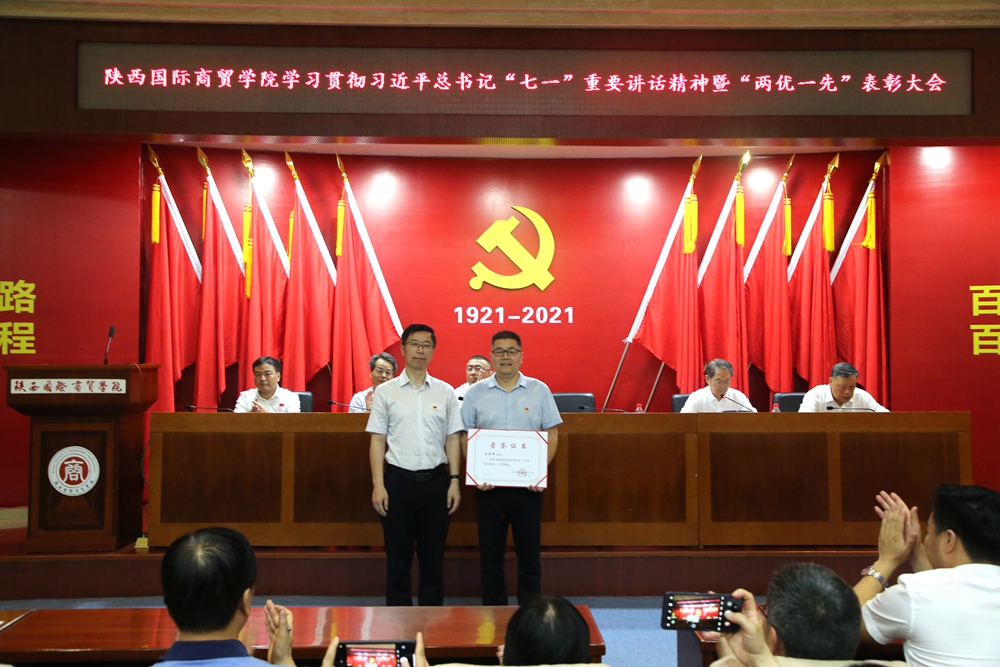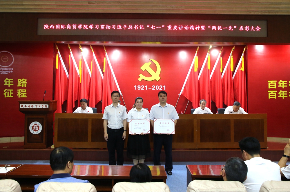 本网讯 传承百年薪火,践行初心使命。2021年7月9日下午,陕西国际商贸学院召开学习贯彻习近平总书记“七一”重要讲话精神暨“两优一先”表彰大会。深入学习贯彻习近平总书记在庆祝中国共产党成立100周年大会上的重要讲话精神,重温党的光辉历程,讴歌党的丰功伟绩,传承党的优良传统,总结在党的领导下学校各项事业取得的成绩和荣誉,颁发“光荣在党50年”纪念章,集中表彰一批优秀共产党员、优秀党务工作者、先进基层党组织,为奋力推进学校高质量发展再上新台阶凝聚力量。