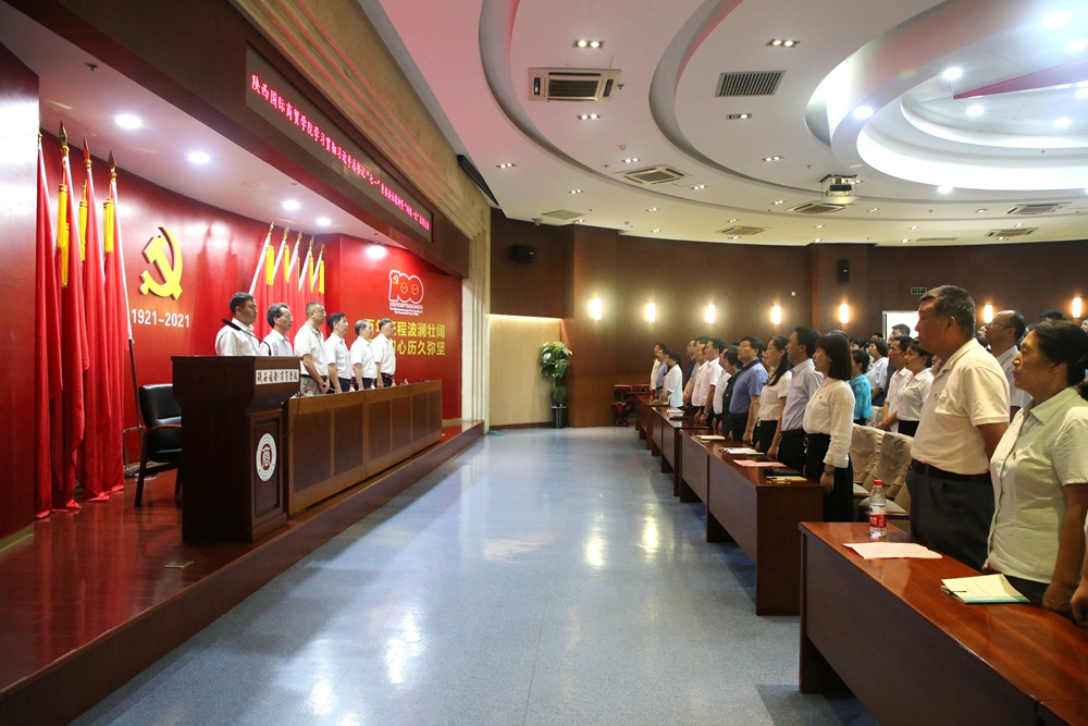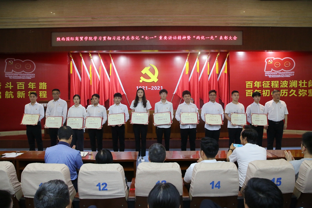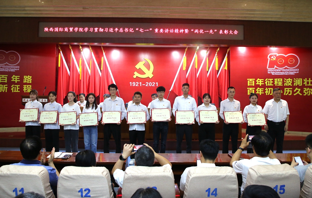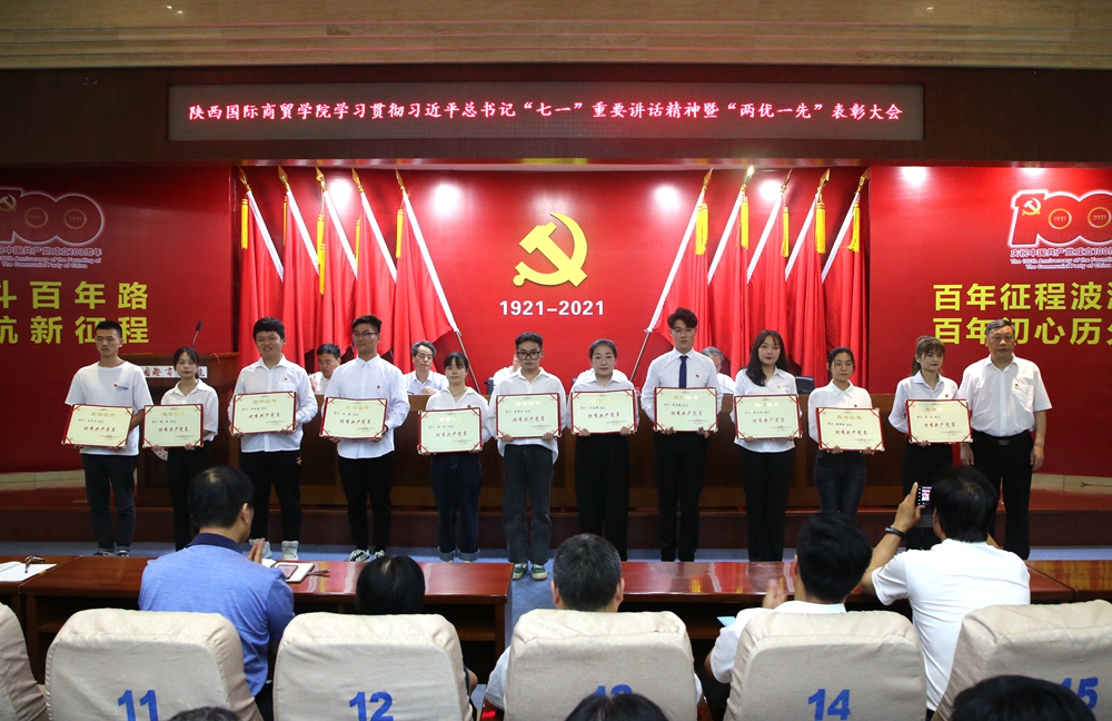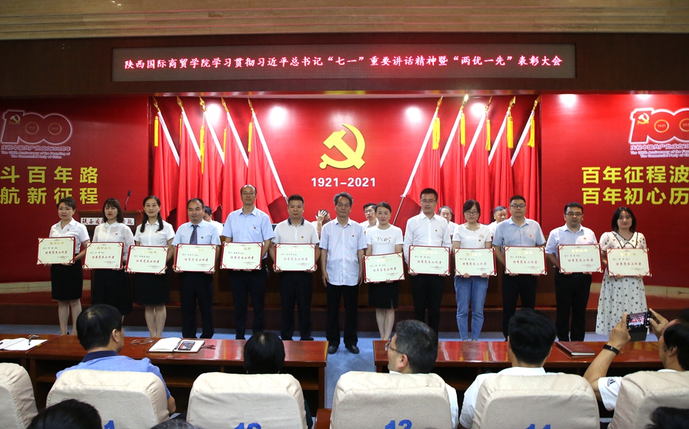 本网讯 传承百年薪火,践行初心使命。2021年7月9日下午,陕西国际商贸学院召开学习贯彻习近平总书记“七一”重要讲话精神暨“两优一先”表彰大会。深入学习贯彻习近平总书记在庆祝中国共产党成立100周年大会上的重要讲话精神,重温党的光辉历程,讴歌党的丰功伟绩,传承党的优良传统,总结在党的领导下学校各项事业取得的成绩和荣誉,颁发“光荣在党50年”纪念章,集中表彰一批优秀共产党员、优秀党务工作者、先进基层党组织,为奋力推进学校高质量发展再上新台阶凝聚力量。
