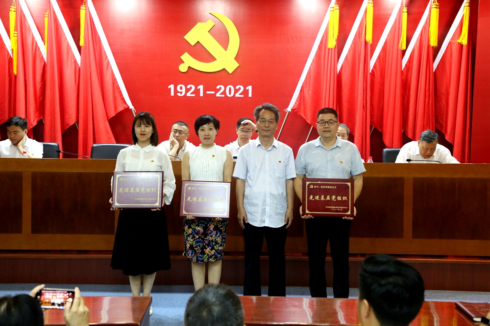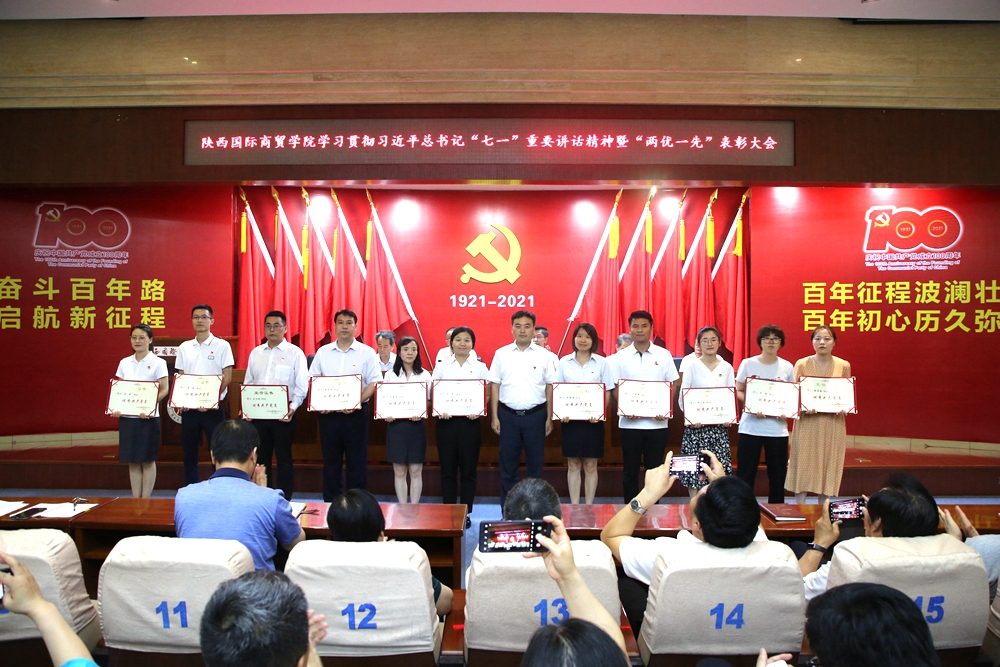 张辉宣读《中共陕西省委教育工委关于表彰全省高校优秀共产党员、优秀党务工作者和先进基层党组织的决定》《中共陕西省委教育工委关于公布首批陕西高校党建工作示范高校、标杆院系、样板支部培育创建单位验收通过名单的通知》《中共陕西国际商贸学院委员会关于做好全校“两优一先”评选表彰工作的通知》。国际经济学院教工党支部被教育部确定为首批全国党建工作样板支部。中共陕西国际商贸学院医药学院教工第二支部委员会被中共陕西省委教育工委授予“陕西高校先进基层党组织”称号。张利军同志、刘志文同志被中共陕西省委教育工委授予“陕西高校优秀共产党员”称号。刘亚峰同志被中共陕西省委教育工委授予“陕西高校优秀党务工作者”称号,胡占梅等75名同志被学校党委授予“优秀共产党员”称号,龚婷等12名同志被授予“优秀党务工作者”称号,医药学院党总支等3个基层党总支被授予“先进基层党组织”,国际经济学院教工党支部等10个基层党支部被授予“先进基层党支部”称号。张辉、康亚国等学校党政领导为受表彰的先进集体和优秀个人颁奖。