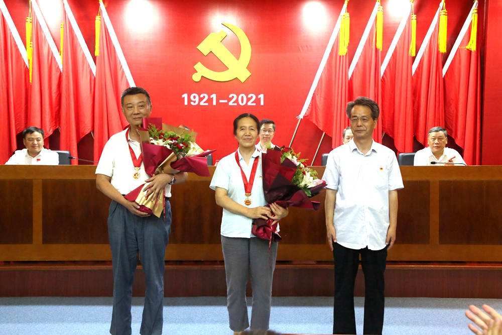 康亚国为“光荣在党50年”的王建武同志和米运卿同志颁发纪念章