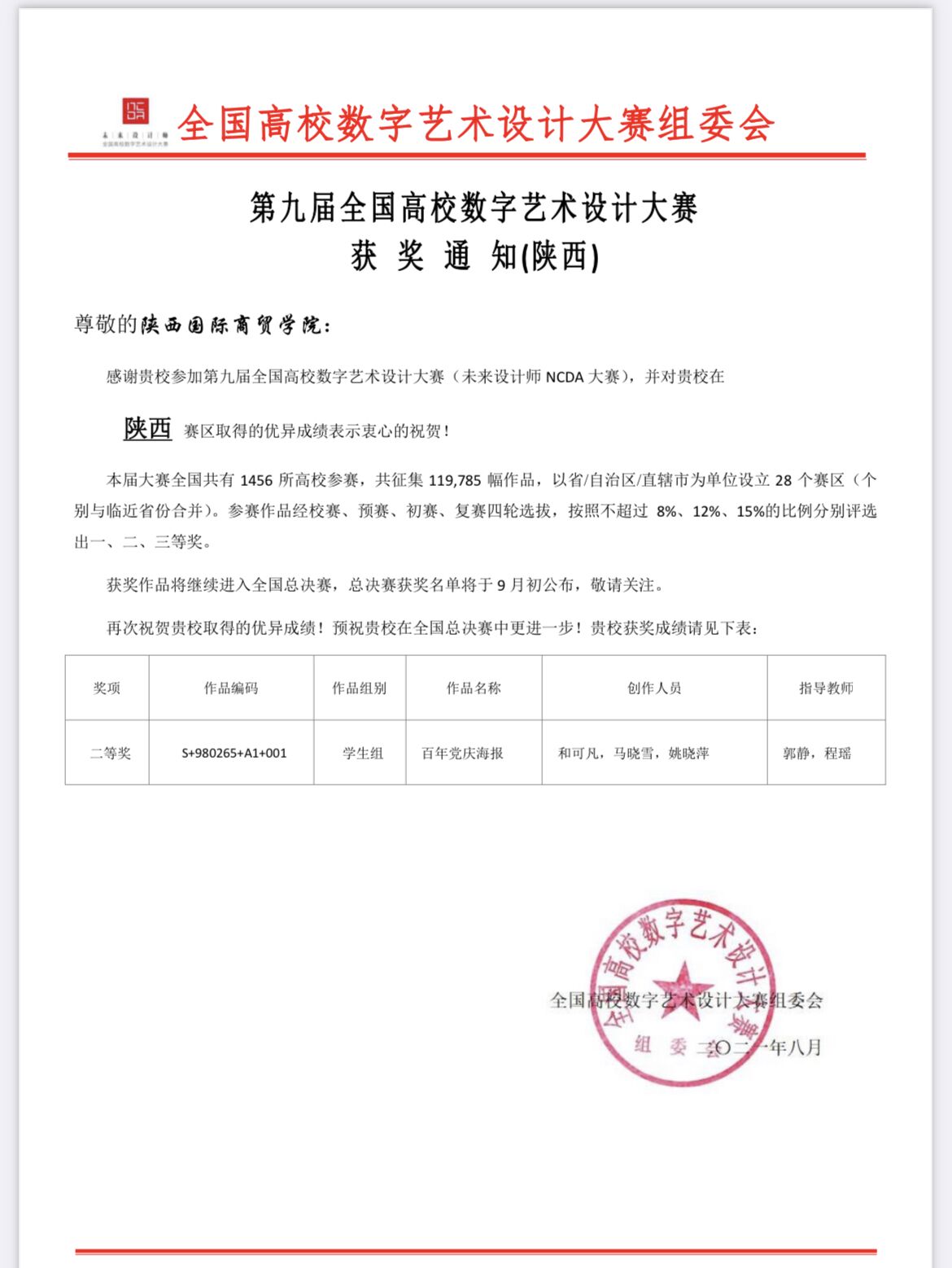 近日,第九届全国高校数字艺术设计大赛落下帷幕,信息工程学院积极组织参赛,最终,由郭静和程瑶老师的指导,计算机科学与技术专业学生和可凡、马晓雪、姚晓萍的参赛作品《百年党庆海报》获得陕西省二等奖。
