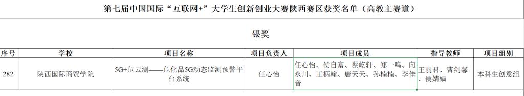 ——在第七届中国国际“互联网+”大学生创新创业大赛陕西赛区中获银奖。近日,第七届中国国际“互联网+”大学生创新创业大赛陕西赛区省级复赛落幕。经过层层选拔,信息工程学院“5G+危云测——危化品5G动态监控预警平台系统”项目获高教主赛道陕西赛区银奖。