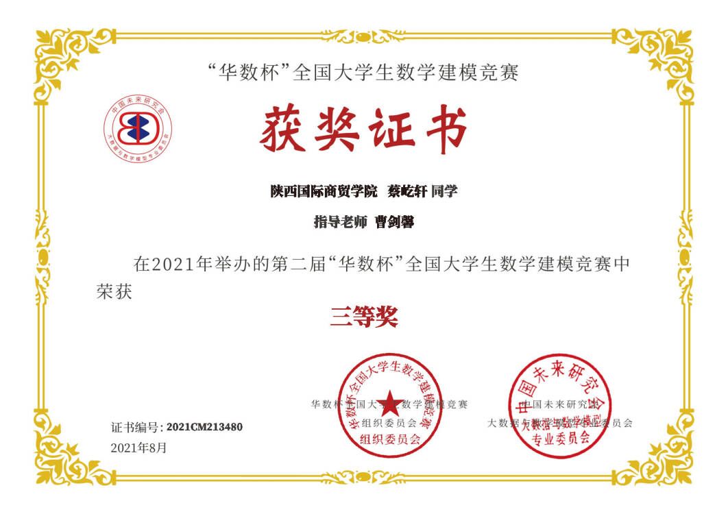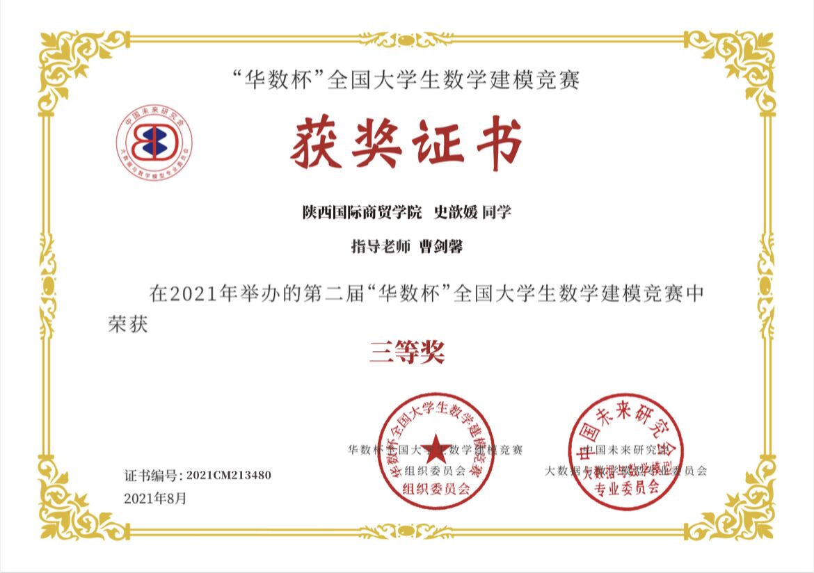 由信息工程(鼎泰现代产业)学院曹剑馨老师指导,2018级本科生蔡屹轩、史歆媛组成的团队在2021年第二届“华数杯”全国大学生数学建模竞赛中荣获全国三等奖。