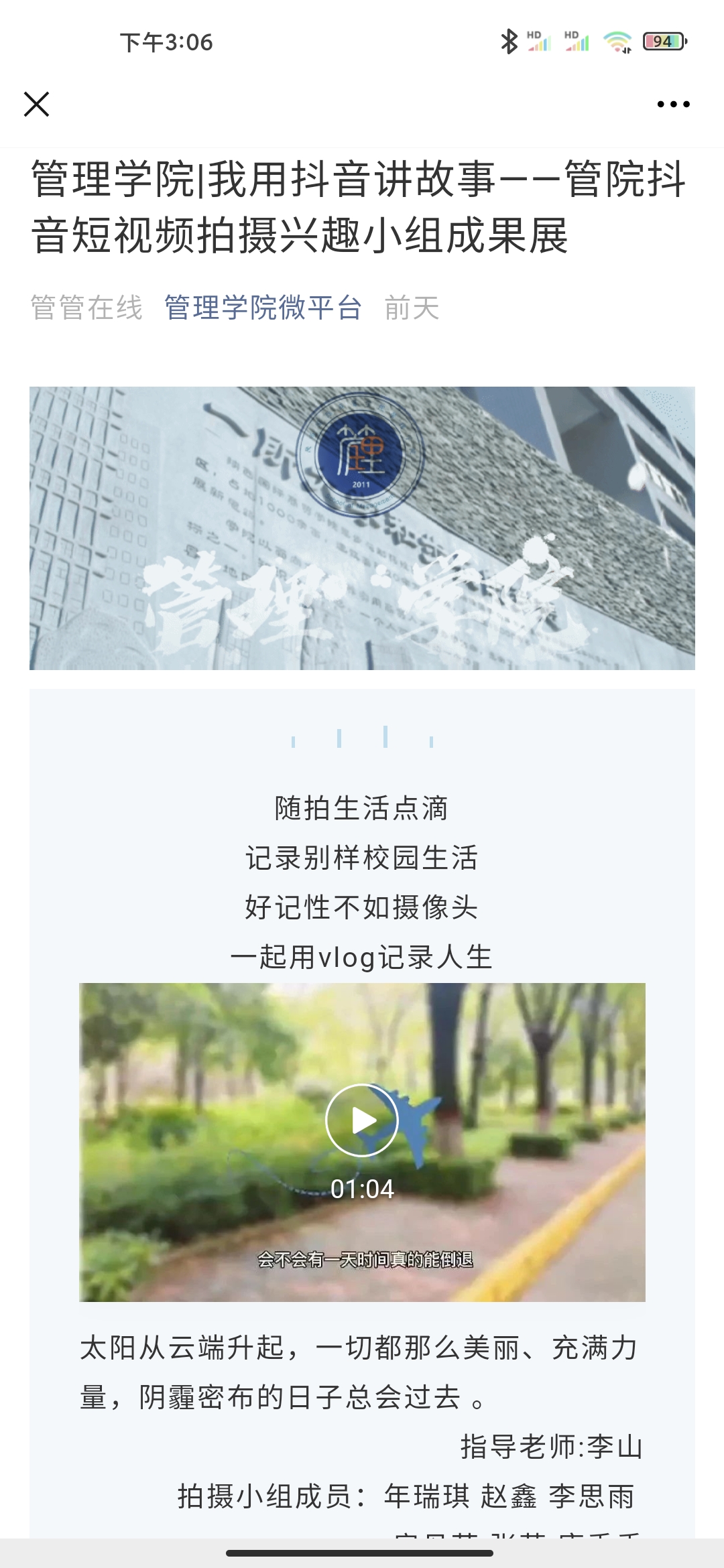抖音短视频兴趣小组很受同学们的欢迎,学习的积极性很高。专业老师耐心细致地讲解拍摄技巧、构图理念、视频剪辑等新媒体操作内容,强烈地引发了同学们的好奇心和求知欲。为了将所学知识融会贯通,学习成员自主成组,拍摄剪辑美好的校园生活,一起用镜头记录青春岁月。最后,在各个兴趣小组活动结束之前,每组成员分工明确,拍摄出各种不同的兴趣活动,然后进行视频剪辑,为本次活动画下圆满的句号。