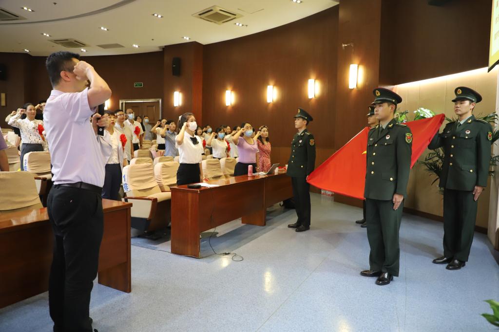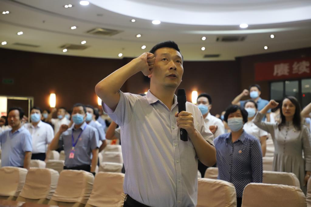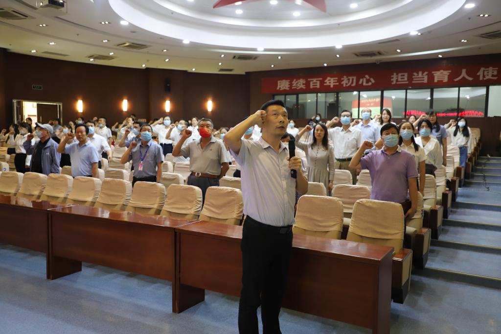 全体与会人员面向国旗庄严宣誓“我志愿做一名光荣的人民教师,忠诚党的教育事业,认真履行神圣职责 ,秉承“立德笃学,允能躬行”校训,修身立德,为人师表,追求真理,崇尚科学,敬业爱生,教书育人,传承文明,勇于创新,启智求真,德业竞进,淡泊名利,乐于奉献,终身学习,不断进步,做有理想信念、有道德情操、有扎实学识、有仁爱之心的好老师,为实现百年商院梦想,为党和人民的教育事业而努力奋斗!”