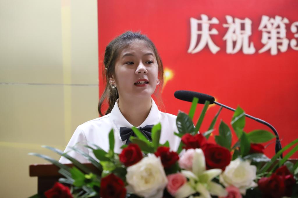 管理学院财务管理B1903班徐文萱作为学生代表,讲述了自己在老师的指引下成长的经历,表示要坚定理想信念,以奋斗进取回报师恩厚望。