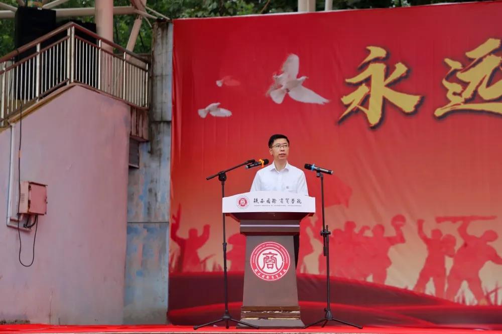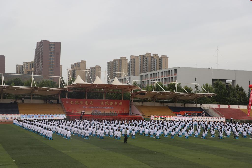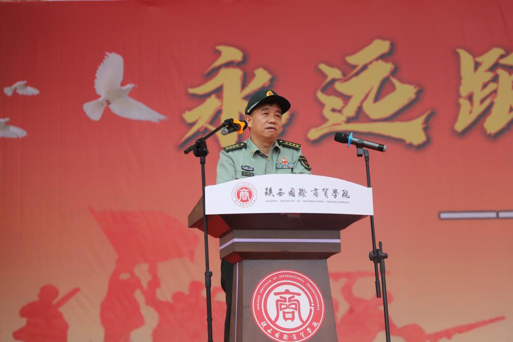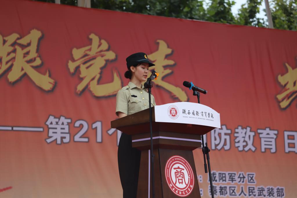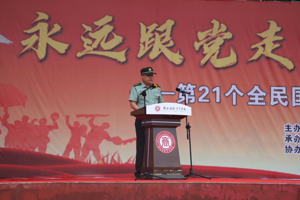本网讯:在庆祝中国共产党成立100周年和正值陕西举办第十四届全国运动会之时。9月16日下午,“永远跟党走,共筑强军梦—第21个全民国防教育日主题宣传活动”在我校体育场举行。本次活动结合开展党史学习教育和学习贯彻习近平总书记“七一”重要讲话精神,目的是铭记党史军史、普及国防知识、强化国防理念,营造关心、支持和建设国防的浓厚氛围。活动由咸阳军分区主办,秦都区人武部承办,陕西国际商贸学院协办。咸阳市委常委、咸阳军分区政治委员张海山,咸阳军分区政治工作处主任杨俊杰,咸阳市秦都区区委常委、人武部政治委员刘春江,咸阳市秦都区人武部部长黄金刚,陕西国际商贸学院校长张辉,党委书记、督导专员康亚国,副校长李吉友以及我校600余名师生代表参加了活动。活动由咸阳军分区副司令员曹红学主持。