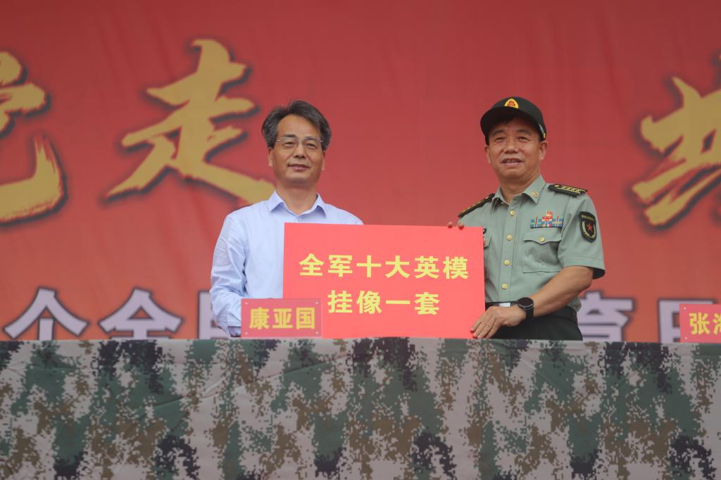 张海山向学校赠送了全军十大英模挂像,康亚国代表学校接赠。