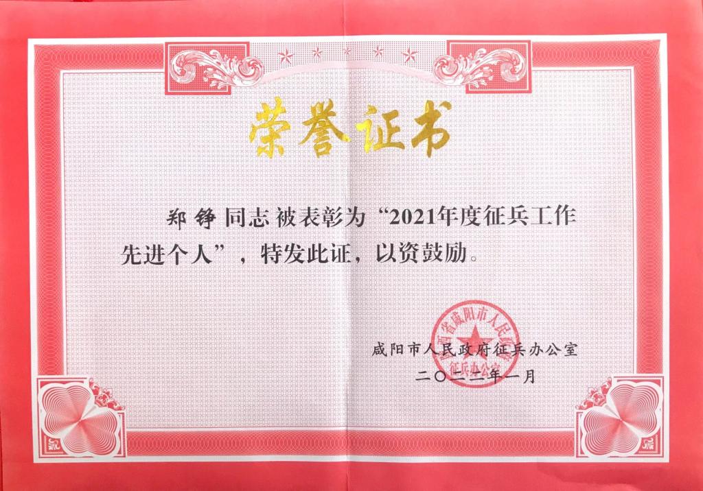 本网讯:近日,陕西省人民政府征兵办公室、陕西省教育厅印发《关于表彰2021年高校征兵工作先进单位和先进个人的通报》(陕征[2022]2号),我校荣获陕西省2021年高校征兵工作先进单位。学生工作部郑铮同志被咸阳市人民政府征兵办公室授予“2021年度征兵工作先进个人”荣誉称号。