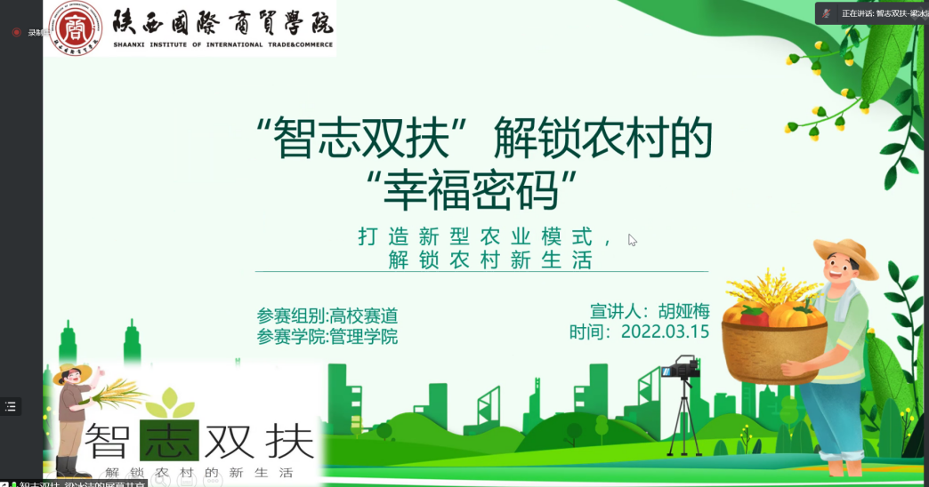 本网讯:3月15日下午,管理学院2022年 “互联网+”大学生创新创业大赛路演在线上平台腾讯会议上顺利举行。管理学院院长胡翮、书记雷萍、副院长刘勤燕、创新创业学院教师赵小芬、各项目指导教师参与了本次活动,院长助理常引全程主持了本次比赛。