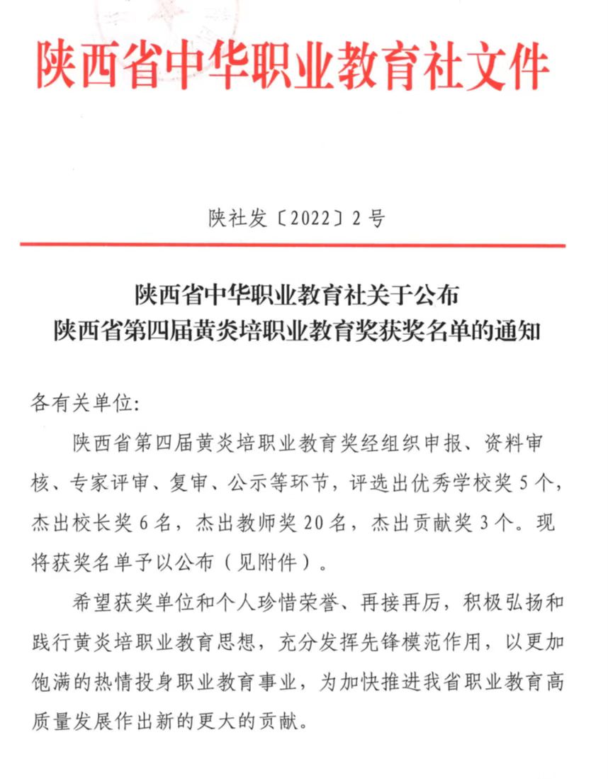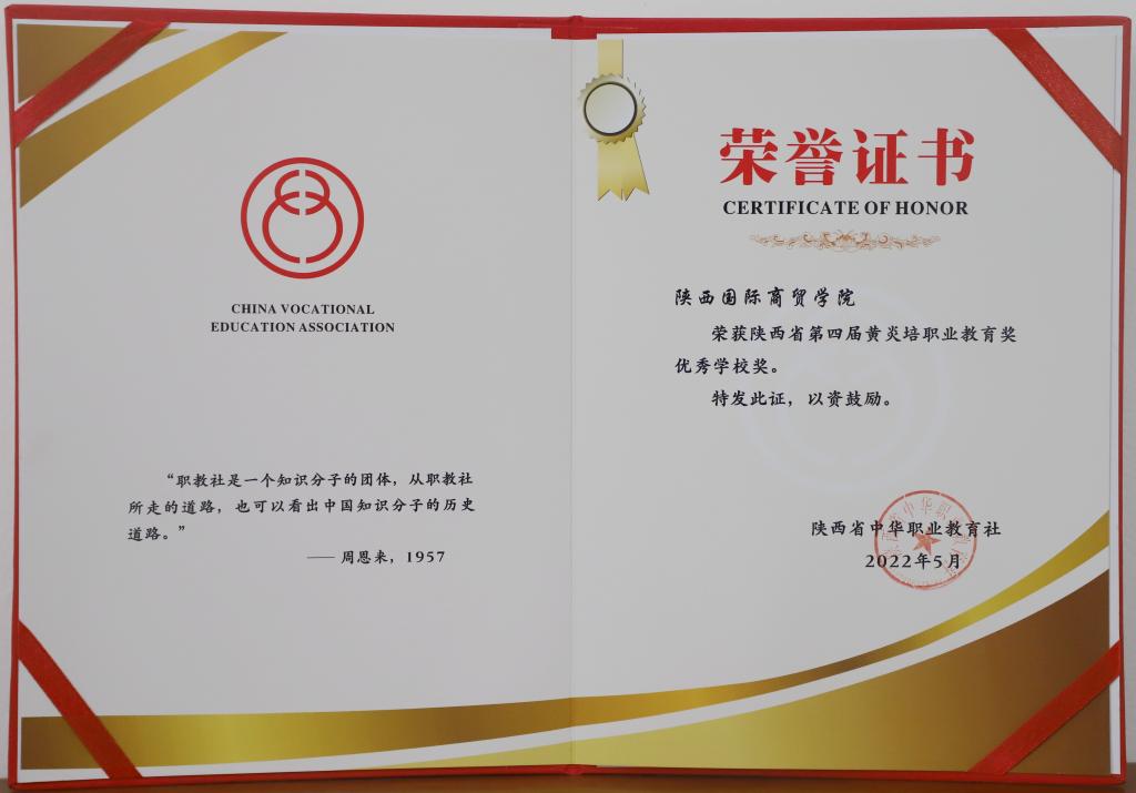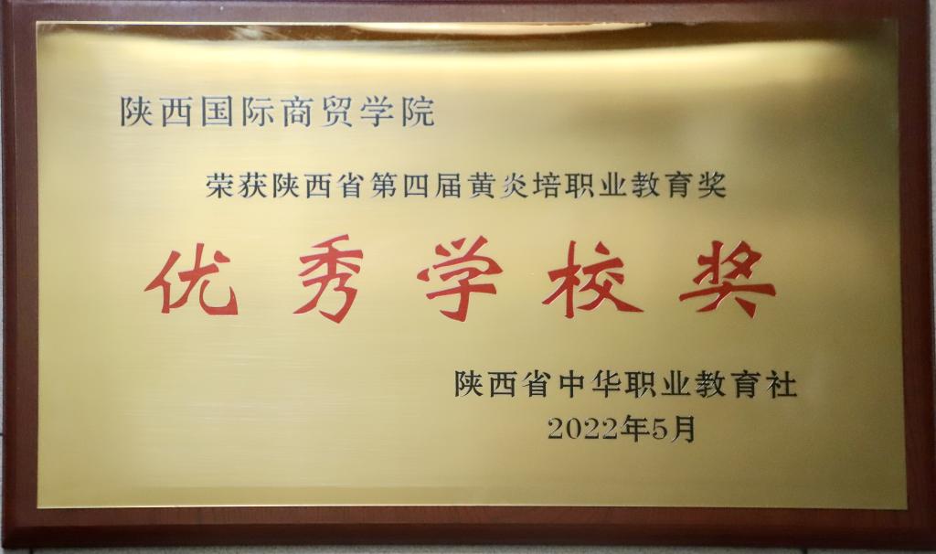 2021年,在董事会和党政领导的关心指导下,我校申报参评陕西省第四届黄炎培职业教育奖,经过资料审核,专家评审,复审,公示等环节,评委会一致认为我校在职业教育领域和产教融合,校企合作方面表现突出,获得陕西省中华职教社评审委员会高度认可,被评为“优秀学校奖”。全国政协常委,陕西省政协副主席,陕西省中华职教社主任李冬玉为我校颁奖,我校副校长万青代表学校领奖。