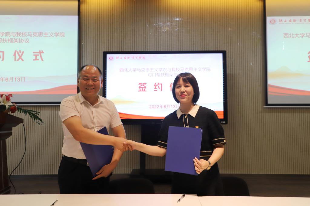 会议中,双方马克思主义学院相关负责人分别介绍了本校及其马院的发展情况。对下一步的帮扶工作规划进行了深入、全面的交流,最终确定将从教师队伍培训、教学能力提升、科研项目指导等方面着手,加强对我校马克思主义学院的帮扶。并签署了对口帮扶合作框架协议书。