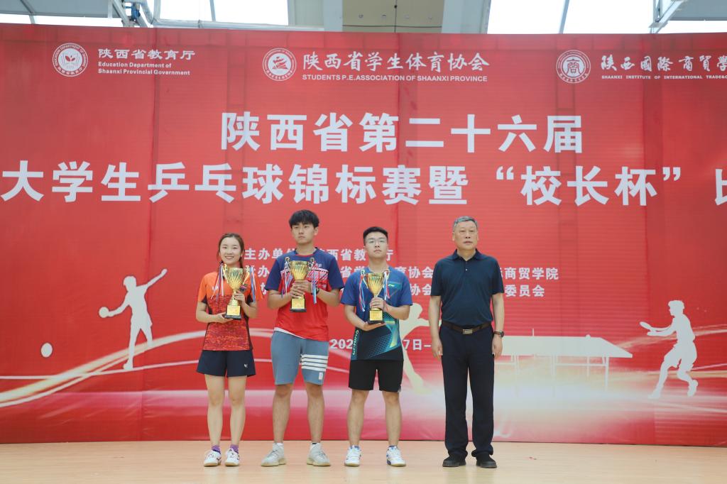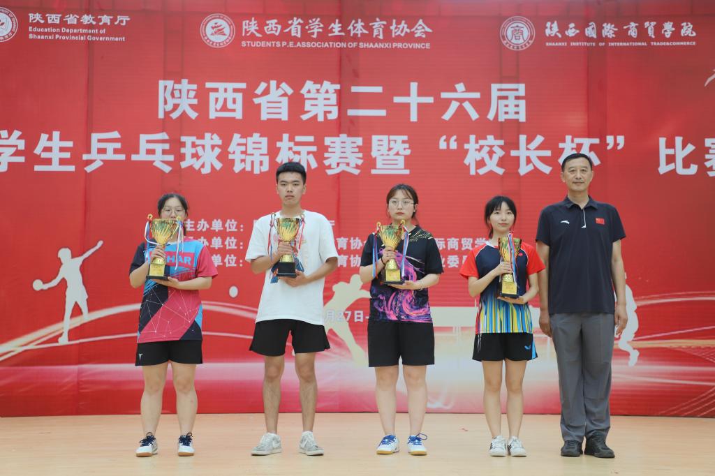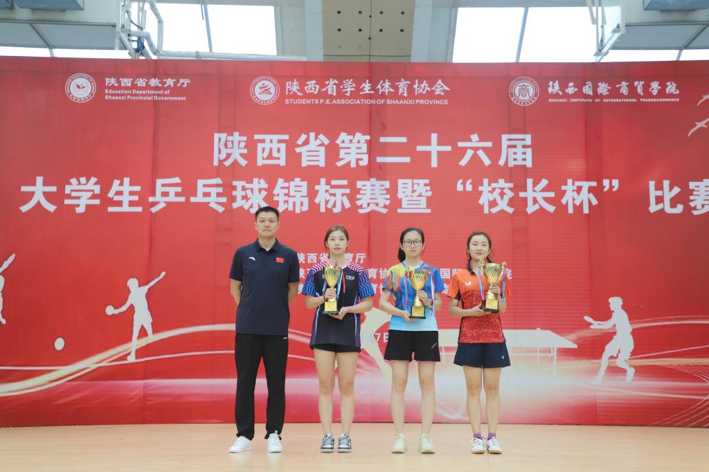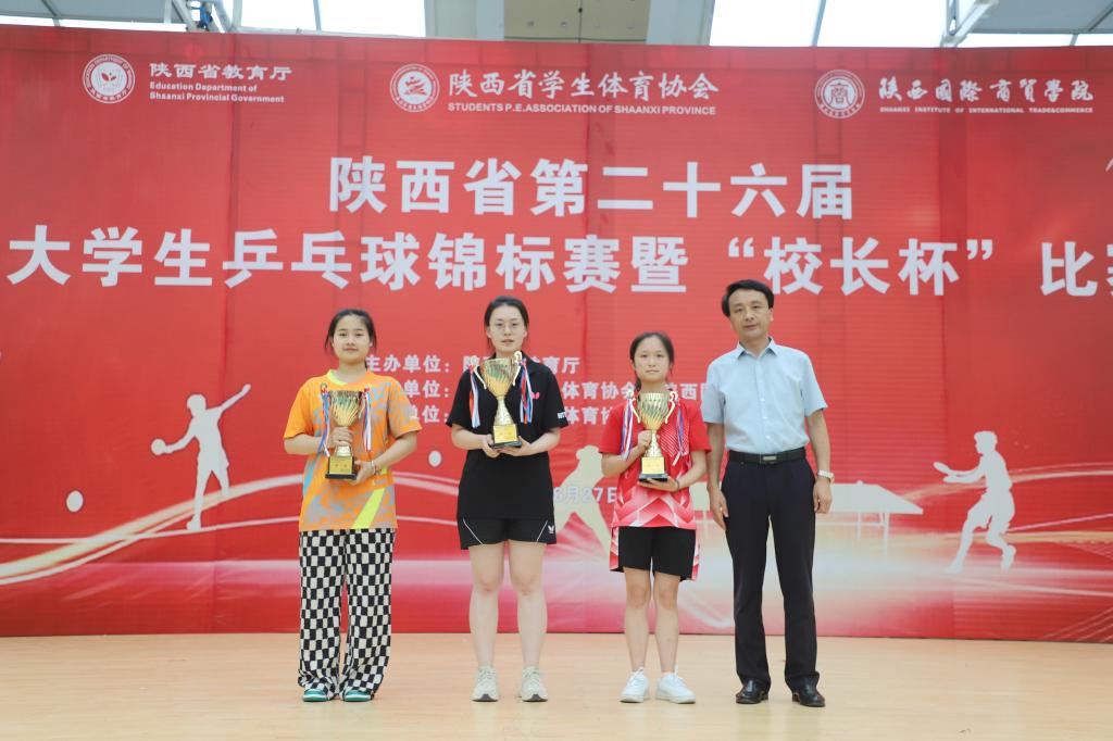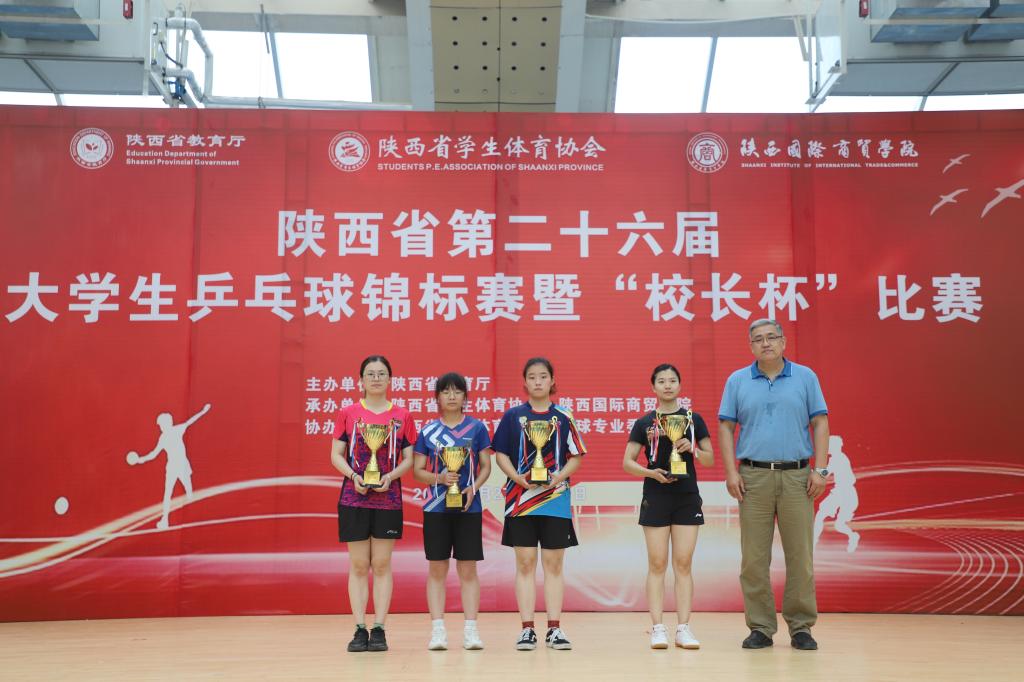 本网讯:7月3日,陕西省第二十六届大学生乒乓球比赛暨“校长杯”比赛在陕西国际商贸学院步长体育馆圆满落下帷幕。我校被陕西教育厅授予“优秀组织奖”“体育道德风尚奖”。我校也荣获学生丁组女子团体第五名和“校长杯”乙组团体第七名及“校长杯”女子单打第二名的好成绩。