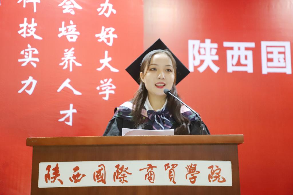 管理学院赵丽作为教师代表祝同学们毕业快乐,四年的学习生涯,你们在这里收获了学识,历练了品行,成熟了心智,开拓了视野,希望你们在接下来的人生征程中,以梦为马,不负韶华,勇敢前行;文学与教育学院张宇欣同学作为毕业生代表首先感谢商院四年的培养与教育,毕业后,将会带着母校的嘱托和寄语,常怀感恩之心,传承商院文化,点亮梦想之光、成就卓越人生。