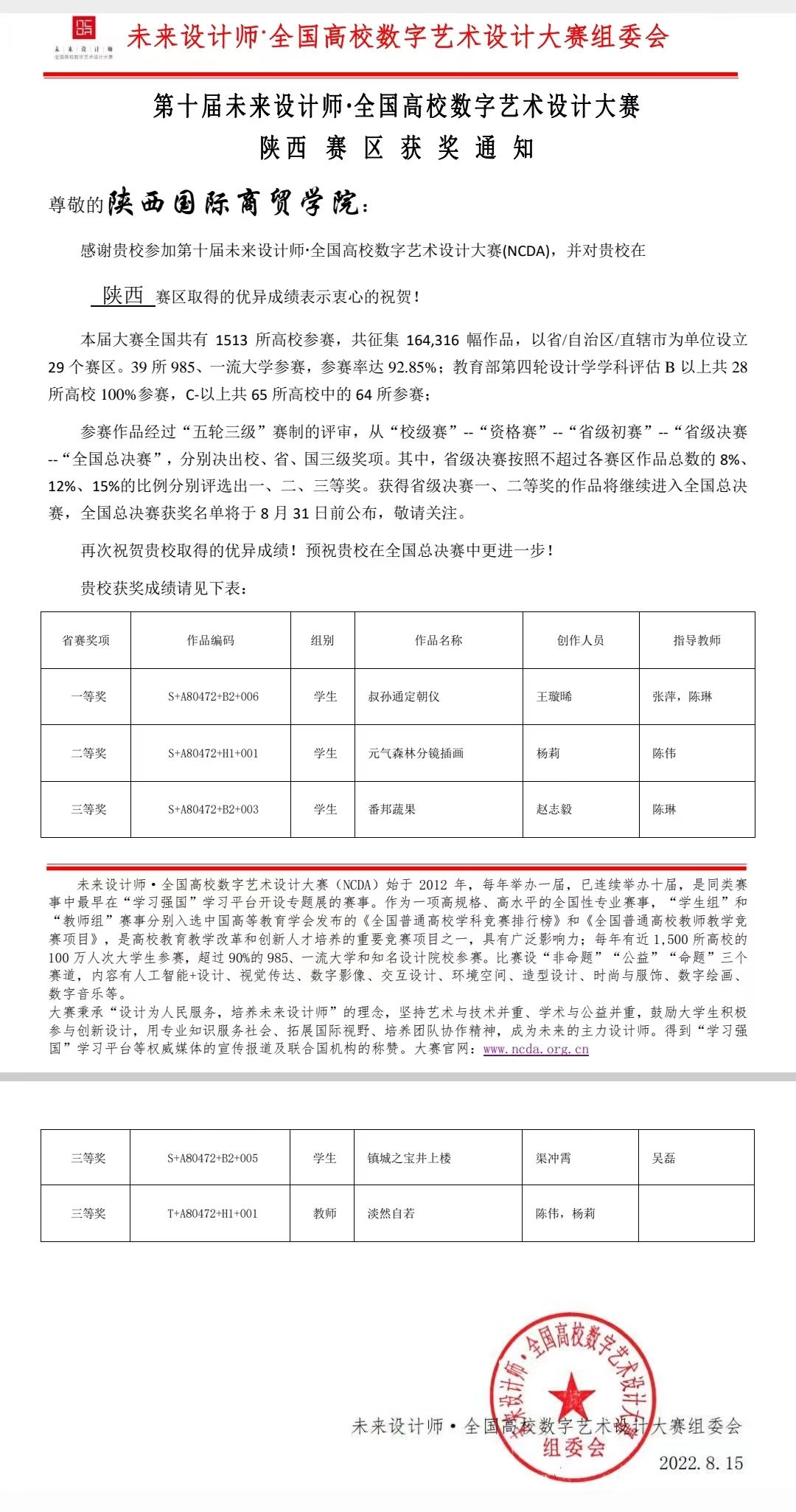 本网讯:近日,2022年第十届全国高校数字艺术设计大赛榜单发布,陕西国际商贸学院师生在本次大赛中分别获得全国总决赛三等奖1项,省级赛区一等奖1项、二等奖2项、三等奖3项,成绩优异。