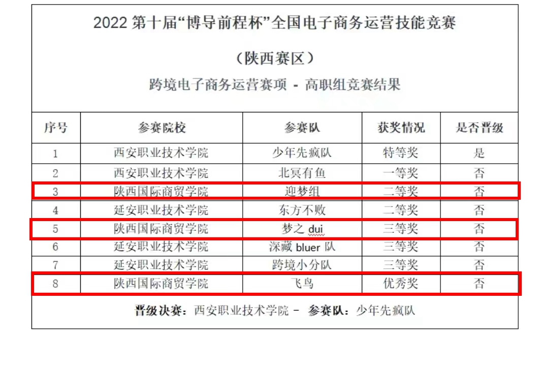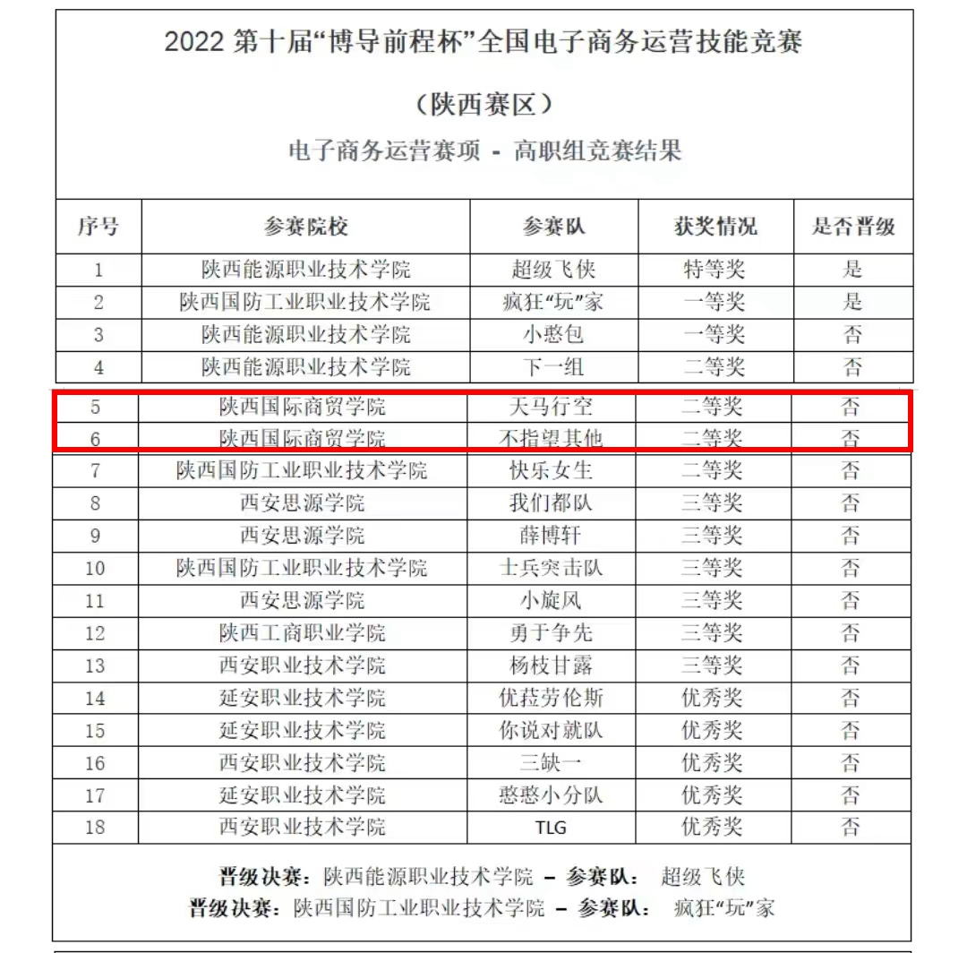 本网讯:近期,第十届“博导前程杯”全国电子商务运营技能竞赛陕西省赛区落下帷幕。经过初赛和决赛的激烈角逐,我校高职学院学生代表队荣获大赛一等奖1项,二等奖4项,三等奖1项,优秀奖2项。其中,由李景景、郭丽娜老师指导的集结号队(成员:何禹茹、马垣烨、白伟伟)晋级国赛决赛。