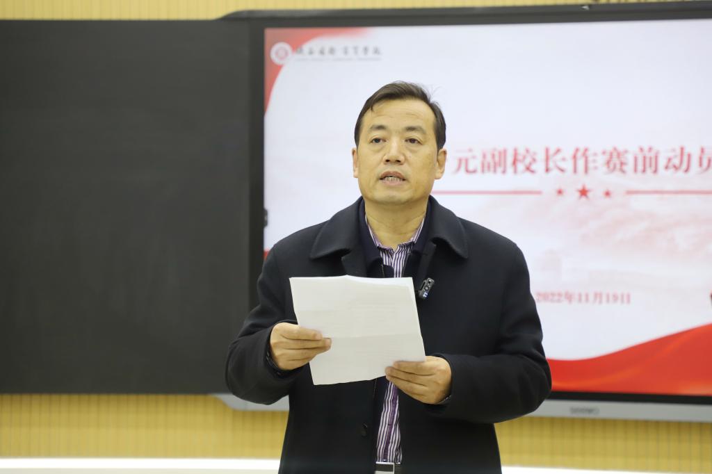 赛前,教务处相关负责人对莅临本次比赛的领导和专家表示欢迎,并对总决赛赛程进行了介绍,随后杨子元作赛前动员讲话。他首先对百忙之中抽出时间参与我校评审的专家表示感谢,并对进入总决赛的教师表示祝贺,同时他提出三点要求,一是希望各教学单位不断加强基层教学组织建设,落实立德树人根本任务,提高人才培养质量;二是希望全校教师更新教育教学理念,创新教育教学方法,落实好“学生中心”的课程建设思路,推动教育教学改革;三是希望教务处、教师发展中心等有关单位继续为教师发展成才搭建平台、提供支持,在全校范围内进一步营造浓郁的教育教学良好氛围。