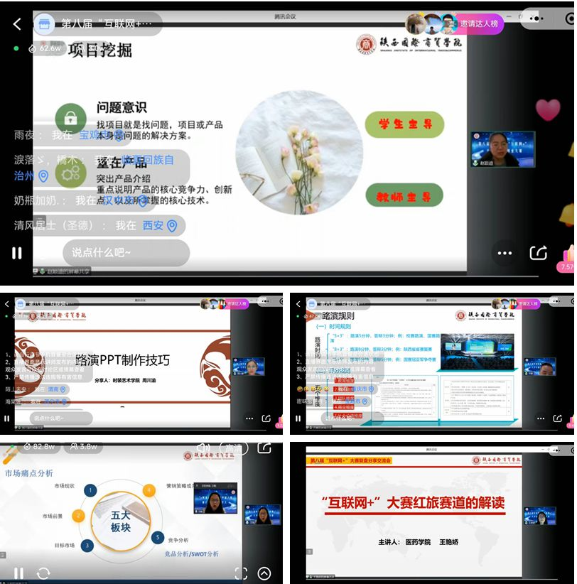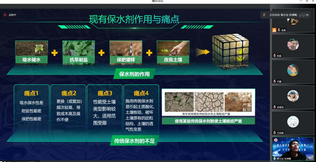 第八届大赛国赛铜奖项目《聚水宝科技-中国种植业的保水保肥专家》项目负责人张博曦同学、省赛金奖项目《智慧商管家-打造属于“您”的私域流量》项目负责人赵兴雾同学依次进行项目路演,同时回顾了项目的发展历程。特邀专家李鑫教授结合自身评审及项目辅导经验,对项目进行了全面分析,提出了后续进一步改进的方向,结合历届兄弟院校国赛金奖项目亮点和加分点从项目PPT的封面制作、项目名称的编写、项目概述的撰写、项目背景的介绍、市场分析、解决方案、技术突破、商业模式等方面进行了深入的讲解,给出专业性的建议,对参赛项目的准备和提升指明更加明确的方向。