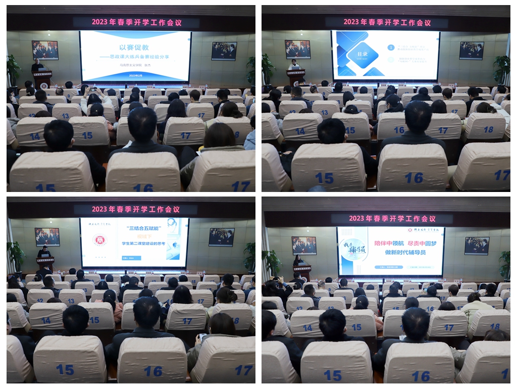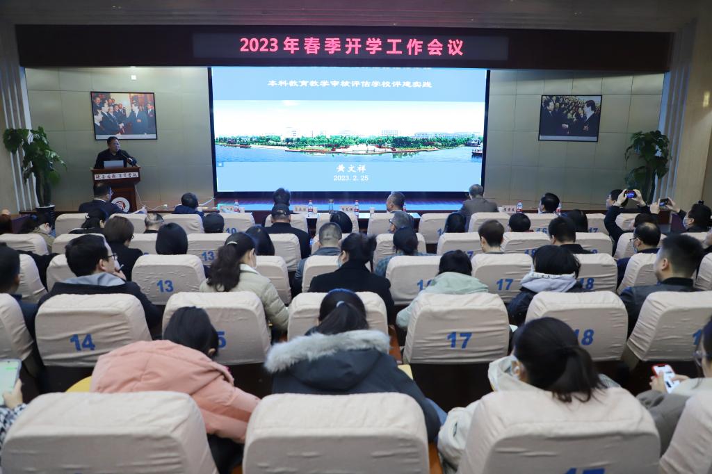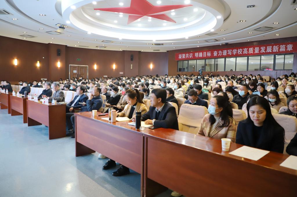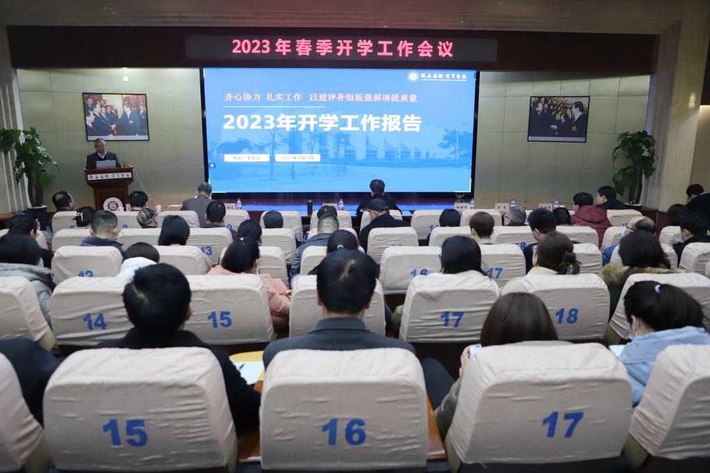 校长王正斌以《齐心协力扎实工作以迎评补短板强弱项提质量》为题作2023年开学工作报告,他从党建引领学校发展,教学质量稳步提升,科研再创佳绩,人事改革积极推进,服务学生能力,推出学校治理新举措,条件保障日益完善,平安校园持续推进等方面全面总结了2022年各项工作;从党建与宣传、行政、教学、审核评估、科研、人事、学生服务、保障服务等方面总结了寒假假期工作;从加强党的全面领导,扎实推进审核评估工作,深化教育教学改革,提高科技创新能力和水平,推进人才强校,提升服务学生育人水平,拓展对外合作交流,提升条件保障能力,提升学校治理能力等9个方面安排部署了2023年工作要点。他强调,2023年,是学校的“迎评攻坚年”,路虽远,行则将至;事虽难,做则必成。全校上下要以习近平新时代中国特色社会主义思想为指导,坚持立德树人这一根本任务,在董事会的坚强领导下,积极抢抓战略机遇,自信自强,守正创新,踔厉奋发,勇毅前行,振奋百年商院精气神,尽职尽责,把工作做实做细,为审核评估工作贡献力量。