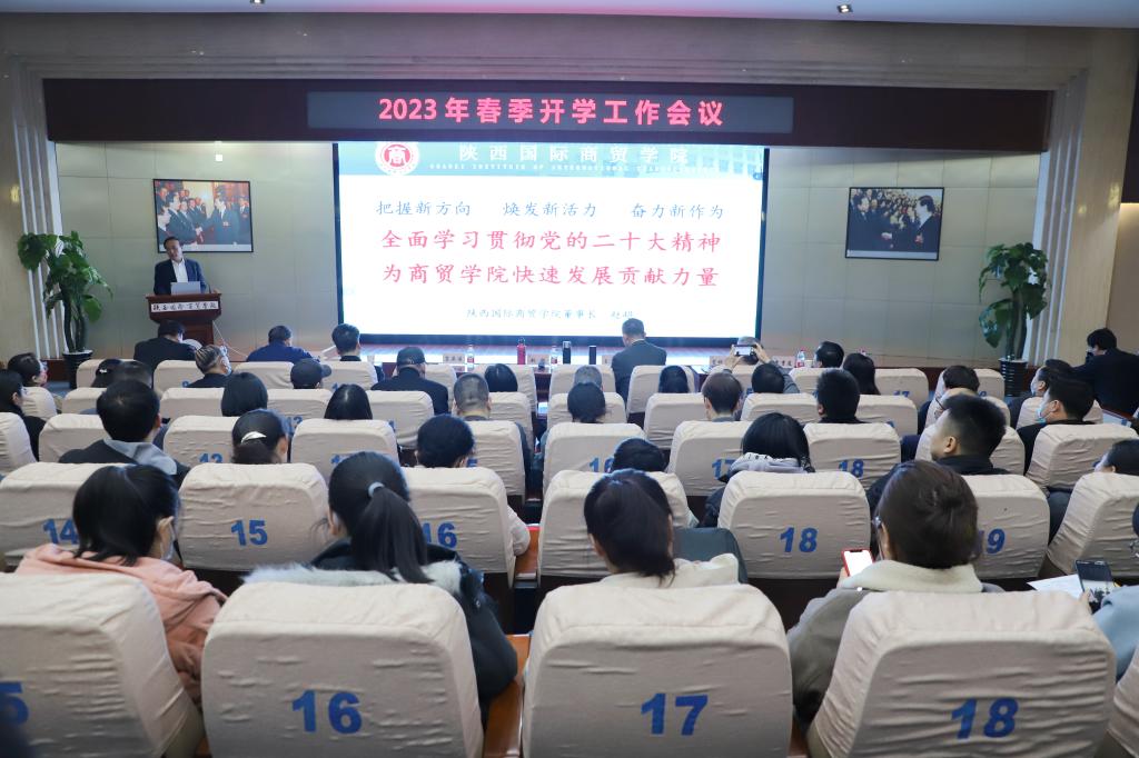 董事长赵超以《把握新方向焕发新活力奋力新作为全面学习贯彻党的二十大精神为商贸学院快速发展贡献力量》为题作开学专题报告,他从认真学习部、省重要讲话和要求,学习学校创始人赵步长教授最新讲话,2022年工作报告重点工作复盘,下一阶段学校工作重点等方面全面系统的阐释了学校2023年的目标与方向,他指出,要以时间倒逼进度,以目标倒逼过程,以责任倒逼落实;他要求,一是学深悟透,提升政治站位。要把学习贯彻培训会议的精神与审核评估工作结合起来,站位世界潮流、国家战略、教育大局,着眼发展规律、客观实际、发展趋势,深刻认识学校发展正处于一个难得的历史机遇期,也是必须向前进的时期,不进则亡;二是找准差距,明确努力方向。要放下包袱,解放思想,树牢开放意识,坚持创新思维,为学校的发展释放强大的开放活力和创新动力,推动学校实现新跨越;三是务实担当,推动工作落实。要始终立足于实、立足于做、立足于效,以审核评估为抓手,着力强基础、补短板、建平台、抓教学、项目制,突出抓好“审核评估”行动方案中各项分管工作的落实,以实际行动为审核评估贡献力量。他强调,要坚定不移听党话、跟党走,树立远大理想、担当时代责任、勇于开拓创新、锤炼高尚品德、矢志拼搏奋斗,努力成为堪当现代化建设大任的先锋力量,真正把忠诚书写在党和人民事业中,把青春播撒在民族复兴的征程上,把光荣镌刻在历史行进的史册里,把伟大时代与青春奋斗融为一体。