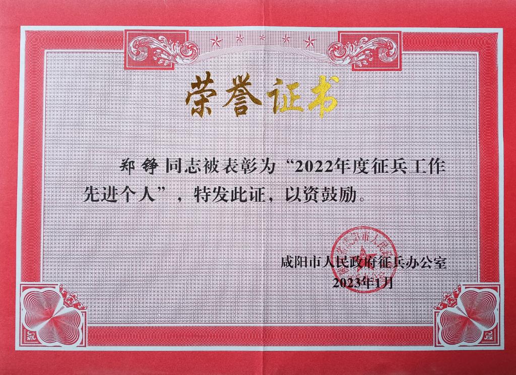 本网讯:近日,陕西省人民政府征兵办、陕西省教育厅联合下发《关于表彰2022年高校征兵工作先进单位的通报》(陕征﹝2023﹞8号),学校被评为陕西省“征兵工作先进单位”,学生工作部郑铮同志被咸阳市人民政府征兵办公室授予“2022年度征兵工作先进个人”荣誉称号。