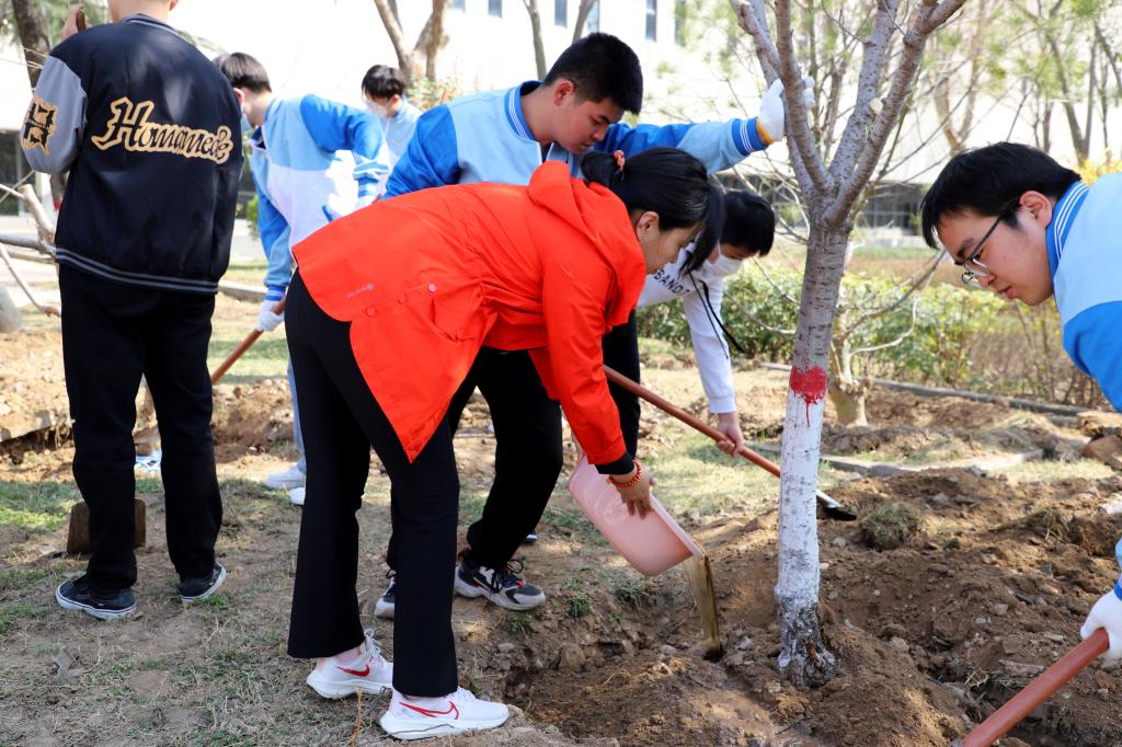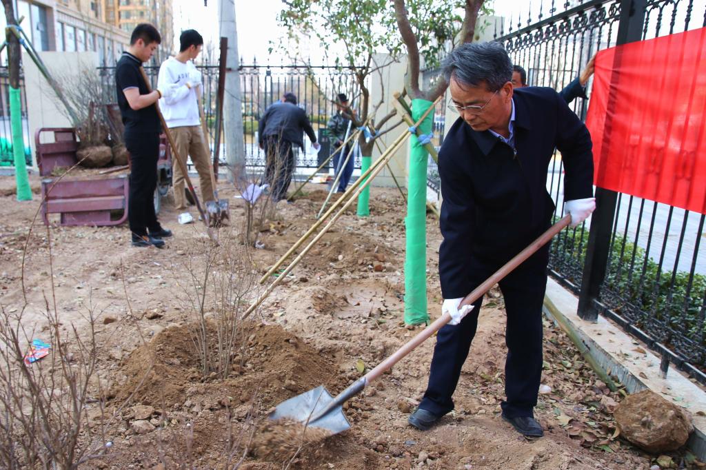 在植树活动现场,师生分工合作,齐心合力,在专业人员指导下,挥锹铲土、施营养肥、填入树苗、培土浇水,每道工序都认真细致,一丝不苟,现场热火朝天的劳动景象成为商贸学院一道美丽的风景线。植树过程中,学校领导边劳动边同师生交流绿化美化环境、建设美丽校园的意见和建议,并勉励同学们在努力学习的同时,树立劳动观念、增强环保意识,共同为创建和谐美丽校园贡献力量。