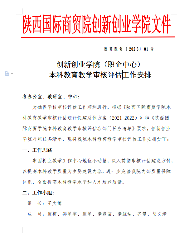——强化制度规范,保障工作进程。为了按时高效完成迎接审核评估工作,学院及时制定了《创新创业学院迎接本科教学审核评估工作安排》,明确了本科教学审核评估进程及时间节点,并对实施方案的有效执行提出了具体要求。制定了两项保障措施。一是在每周的全院工作例会上通报迎评工作进展,对工作中遇到的难点和突出问题进行集中研讨,提出解决措施。二是围绕中心工作过程性抓教学管理,院内积极开展课程建设座谈会,落实教师间交叉听课,教学上做到自查自省,学他人之长,补自身之短,发挥集体力量做好迎评各项准备工作。