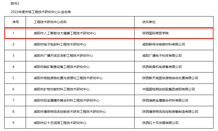 本网讯:近日,咸阳市科技局发布《关于认定2022年"咸阳市重点实验室""咸阳市工程技术研究中心"的通知》,经网上公开申报、专家评审论证、现场答辩,我校信息工程学院王希娟副教授主持申报的咸阳市人工智能与大健康工程技术研究中心被认定为咸阳市工程技术研究中心,我校信息工程学院实现了市级以上科研平台零的突破。