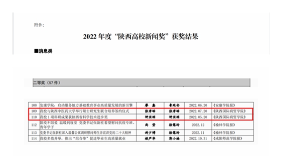 本网讯:近日,2022年度“陕西高校新闻奖”评选结果揭晓,我校由党委工作部张孝峰、钟亚琼撰写的《我校与陕西中医药大学举行硕士研究生联合培养签约仪式》和《我校1项科研成果获陕西省科学技术进步奖》等2件作品分别荣获消息类二等奖。