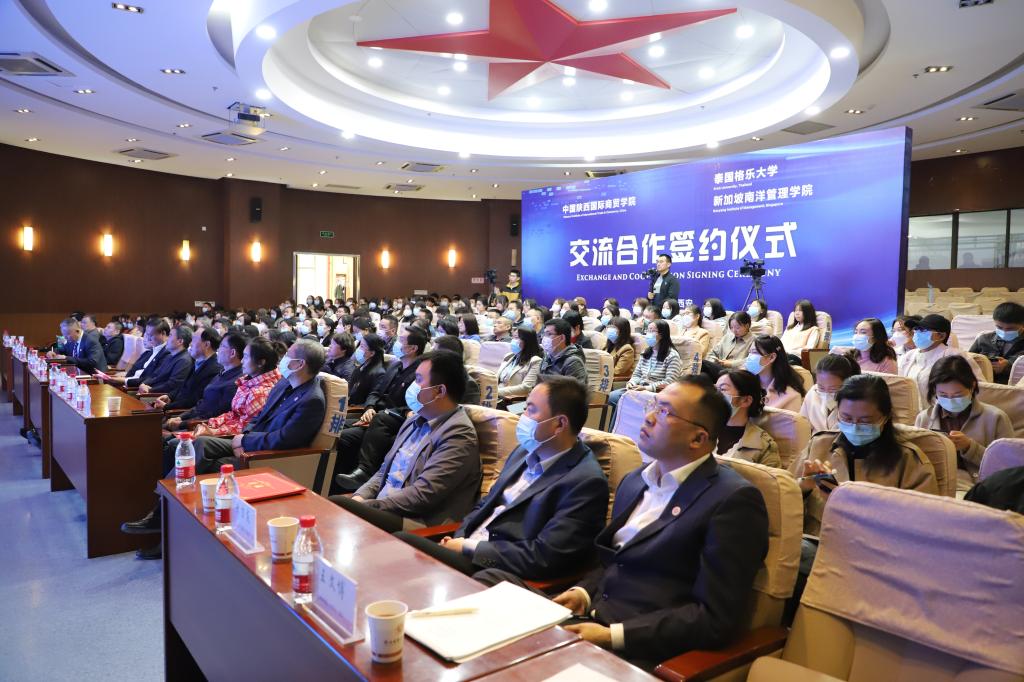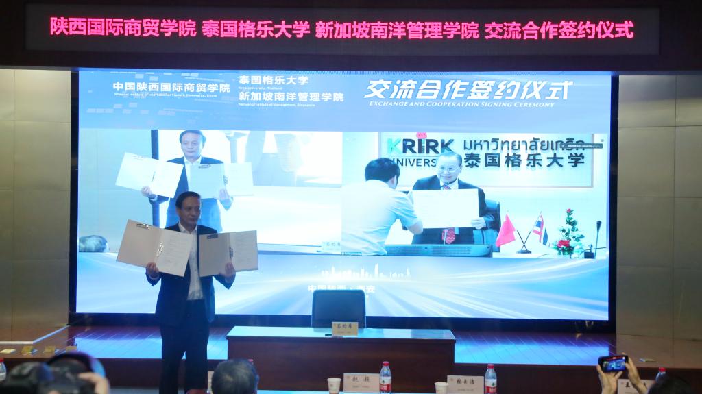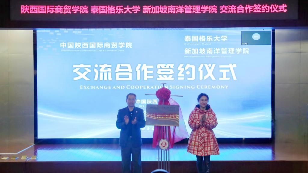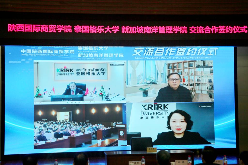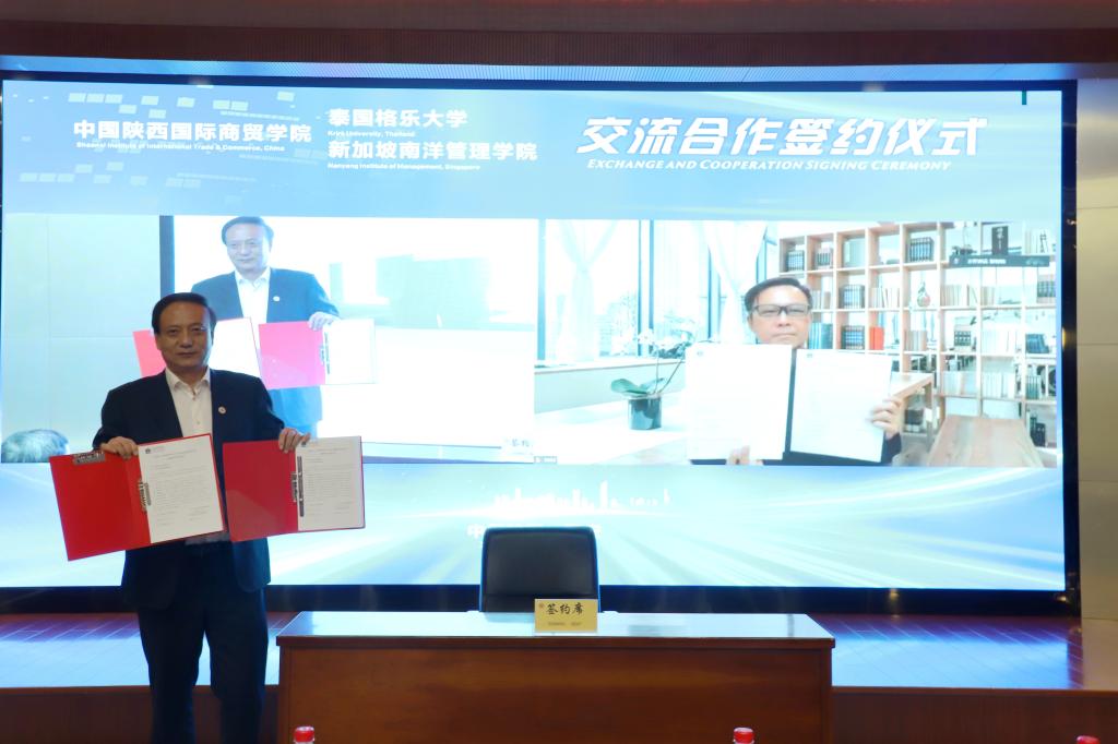 本网讯:为进一步加强国际交流合作,扩大开放办学,促进优质资源共享,陕西国际商贸学院与泰国格乐大学、新加坡南洋管理学院签署交流合作协议。签约仪式于3月15日在陕西国际商贸学院学术报告厅隆重举行。公共卫生专家、泰国格乐大学校长杨金泉教授、新加坡南洋管理学院教学院长汪胜益博士和陕西国际商贸学院董事会董事长赵超博士共同通过线上签署协议文件。泰国格乐大学聘请医药实业家、民办教育家、陕西国际商贸学院学术委员会主席赵步长教授为“荣誉教授”,陕西国际商贸学院聘请公共卫生专家、教育家、泰国格乐大学杨金泉教授为“荣誉教授”。三校决定共建两个二级学院与三个研究机构。