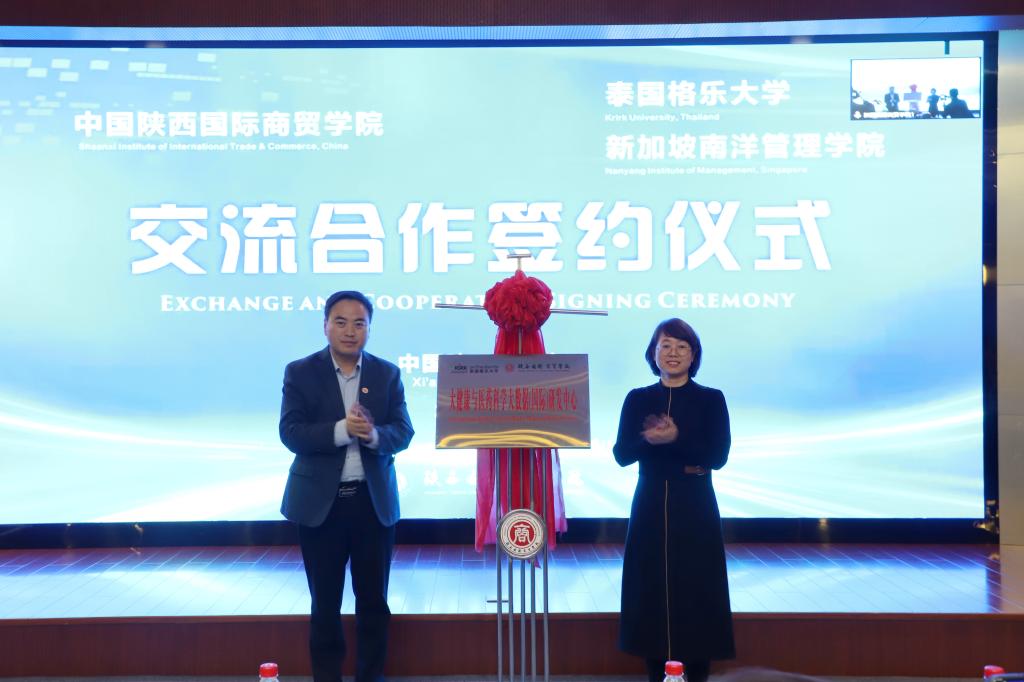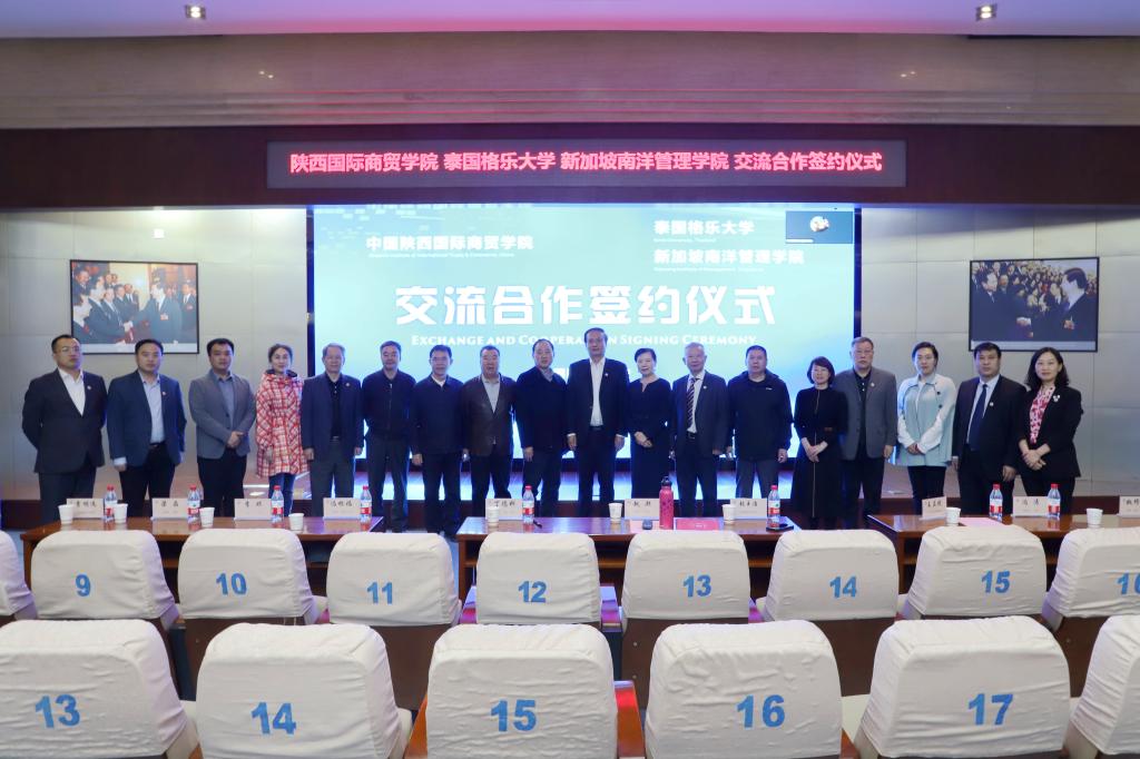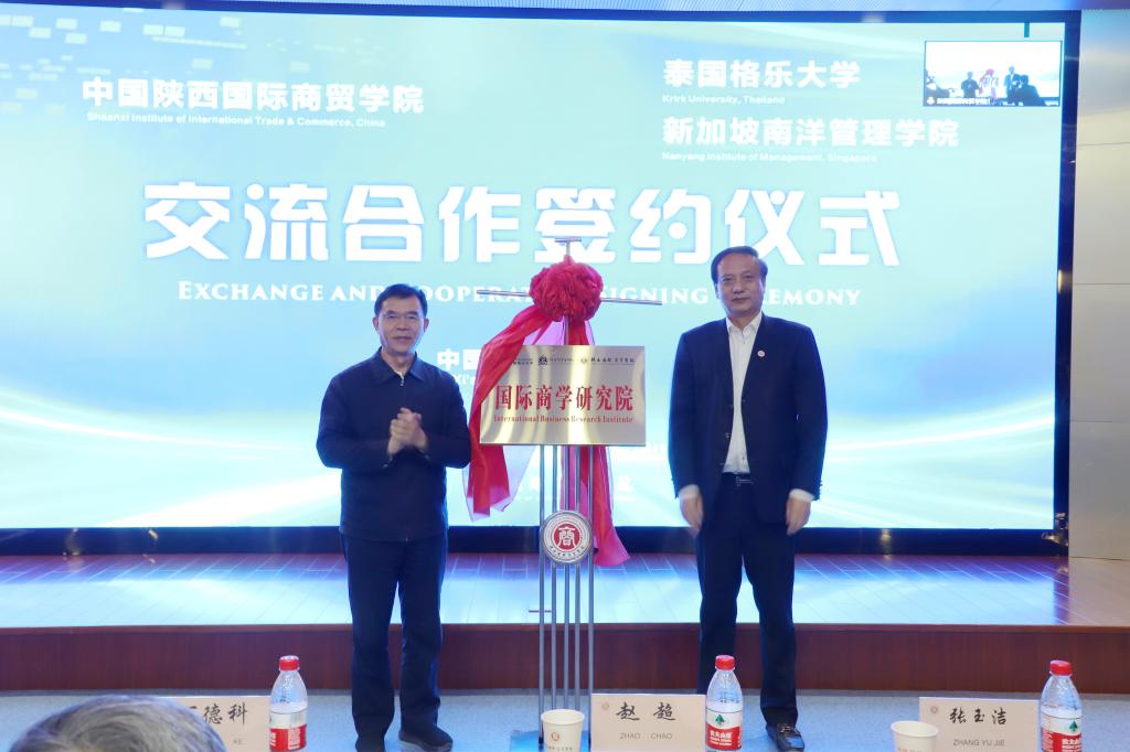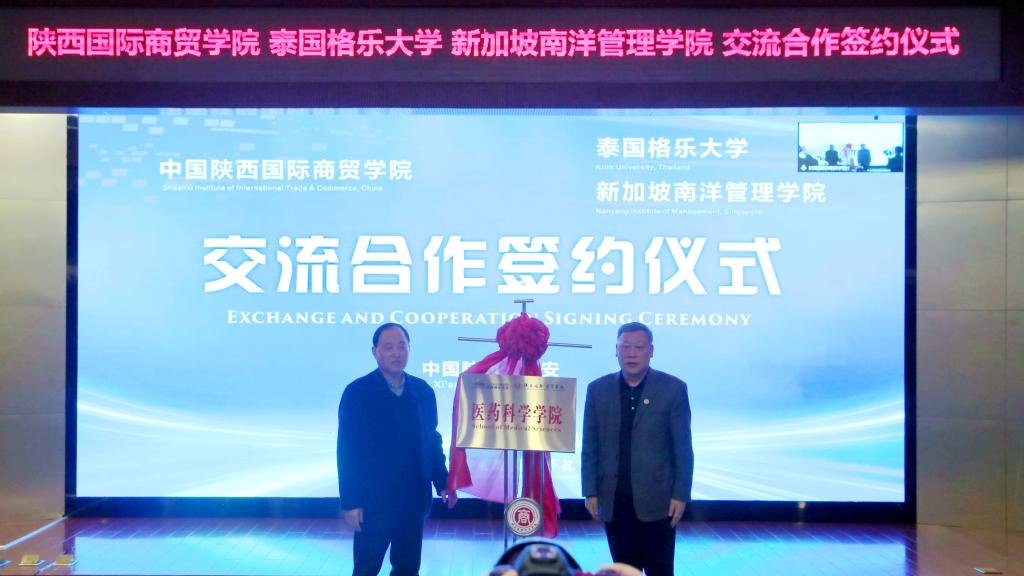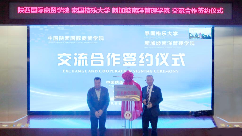 合作交流协议决定泰国格乐大学与陕西国际商贸学院共建陕西国际商贸学院艺术科学学院暨艺术科学(国际)研究院、医药科学学院暨“大健康与医药科学大数据(国际)研发中心”,泰国格乐大学、新加坡南洋管理学院与陕西国际商贸学院共建陕西国际商贸学院国际商学研究院。西安交通大学教授、陕西国际商贸学院国际商学研究院专家委员会主席冯涛,长安大学研究生导师、西安交通大学陕西省艺术与科学研究中心学术委员会副主任、陕西国际商贸学院艺术科学(国际)研究院院长梁晶教授,西安交通大学教授、陕西国际商贸学院国际商学研究院学术委员会主席冯根福,西安交通大学教授、陕西国际商贸学院国际商学研究院院长李琪,西北工业大学教授、陕西国际商贸学院国际商学研究院副院长刘敏先后为合作共建学院和科研机构揭牌。