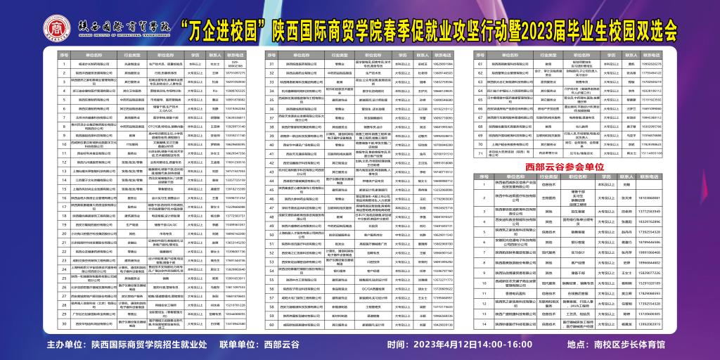 本网讯:为了推进我校2023届毕业生顺利就业,为学生提供更多的就业岗位和更广泛的就业平台,4月12日下午,我校与陕西省西咸新区信息产业园投资发展有限公司联办的 “万企进校园”春季促就业攻坚行动暨2023届毕业生校园招聘会在步长体育馆隆重举行。