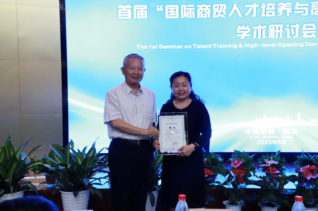 陕西国际商贸学院董事长赵超,校长王正斌,常务副校长贾明远分别为冯根福、李琪、崔建军、李香菊、魏修建颁发国际商学研究院特聘教授聘书。