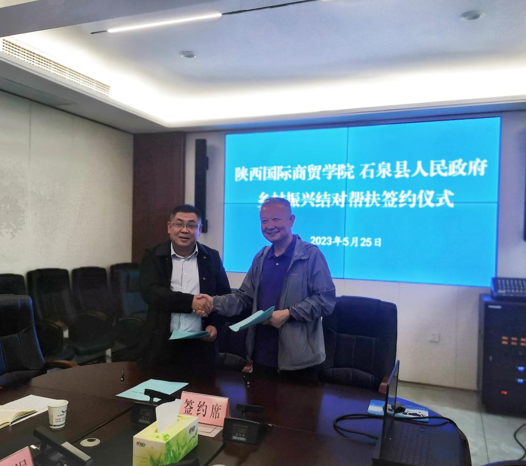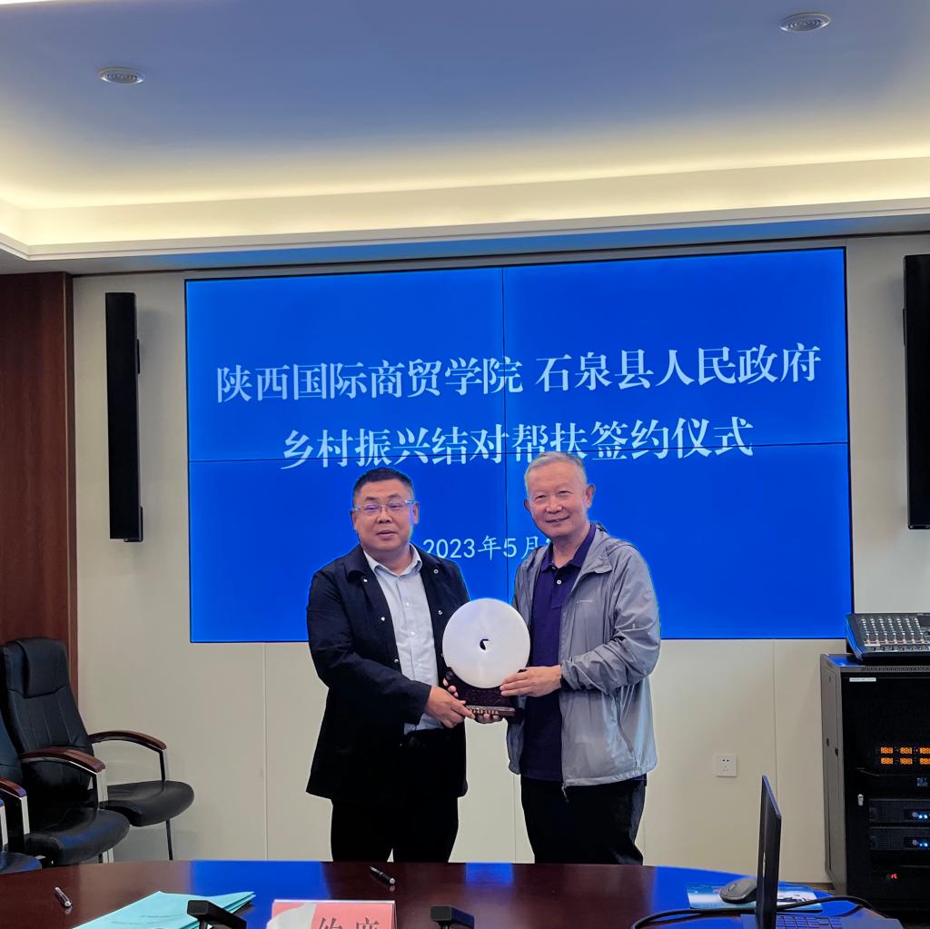 经过前期校县反复交流和探讨,在座谈会上校县双方领导签署了《陕西国际商贸学院结对帮扶石泉县人民政府意向书》,并赠送了纪念品。