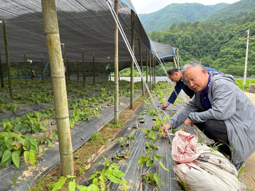 调研期间,王正斌一行先后参观了中心村本草溪谷中药材种植基地、齐心村黄精中药材种植基地和双河村药材种植基地等3个中药材培育基地,了解了基地里各种中草药的种植情况及药用价值。