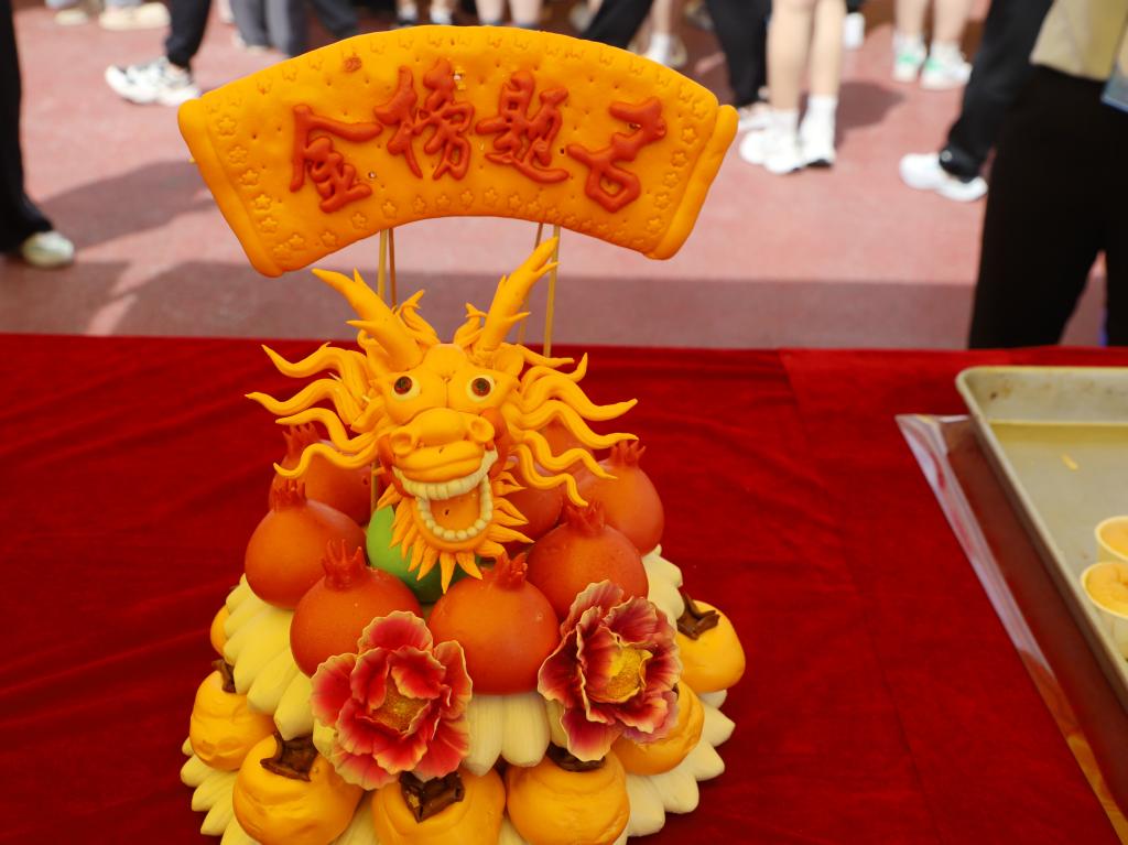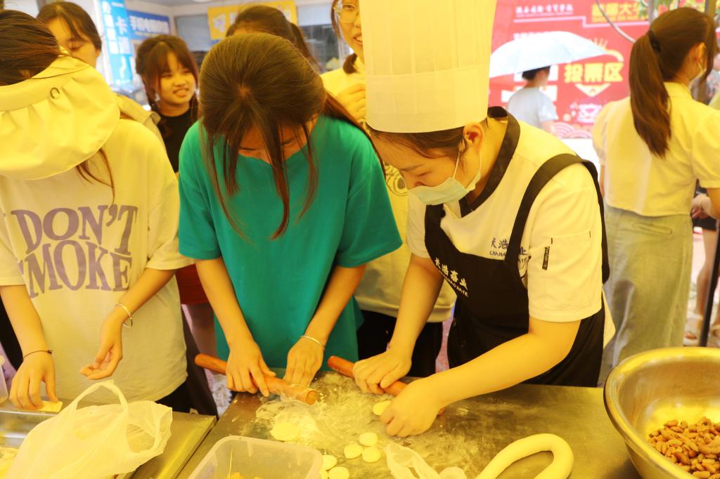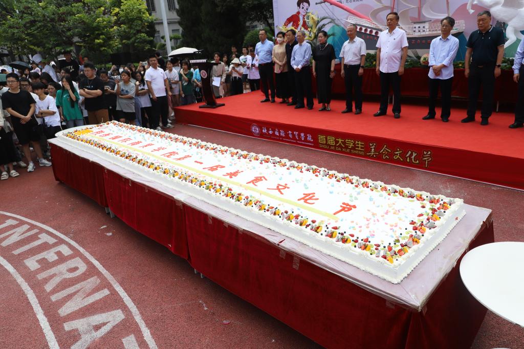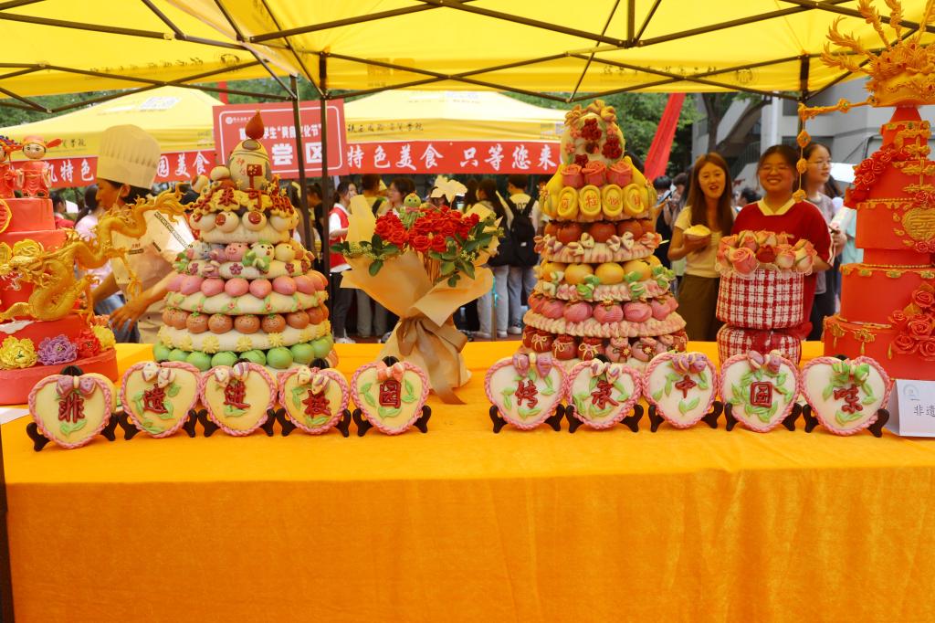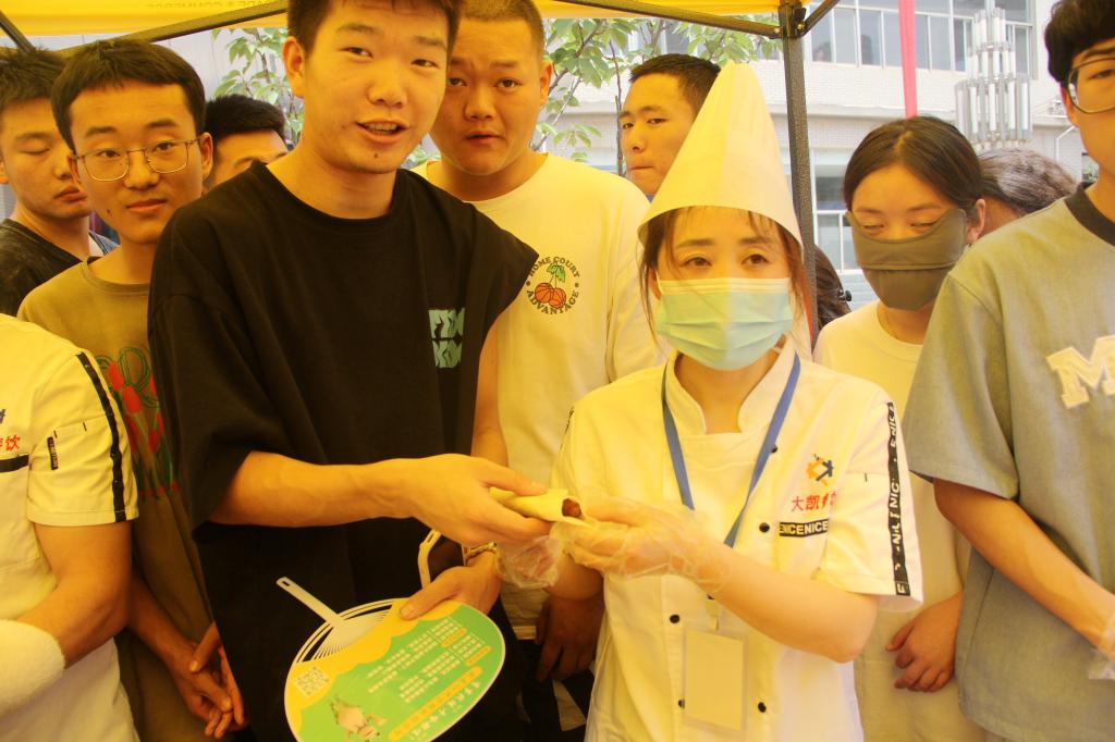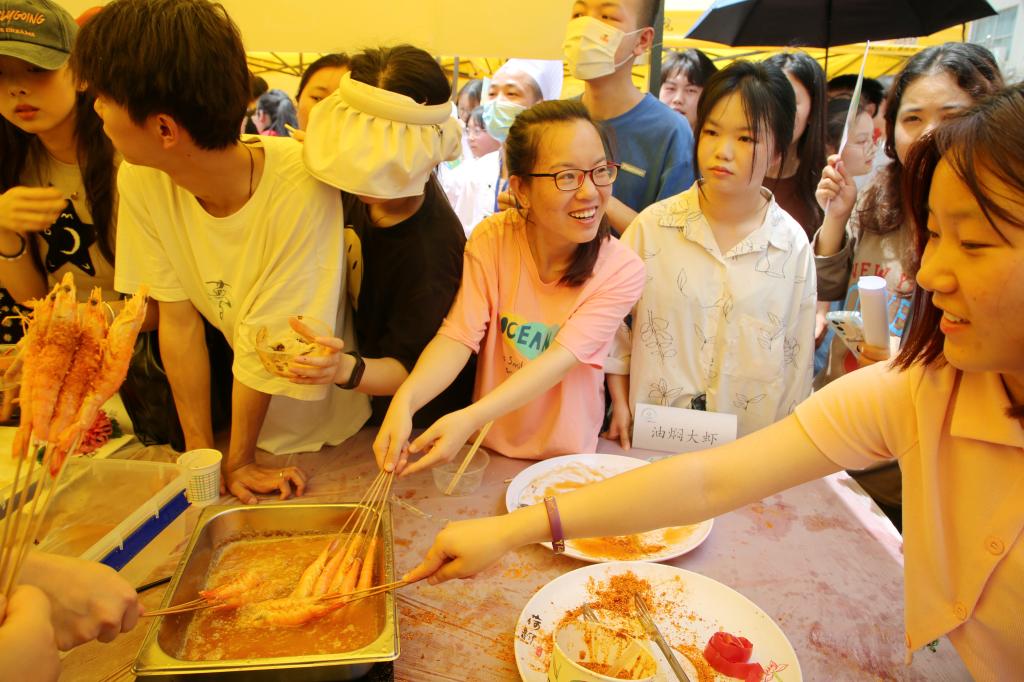 巨型蛋糕、烤全羊、淄博烧烤、蒸饺、金线油塔、寿司、特色龙虾……桌子上摆满了色香味俱全的各类菜肴,校内各家餐饮公司纷纷拿出自家绝活,各色美食精彩呈现,广场上食物飘香,让人垂涎欲滴。师生们三五成群,在各个美食摊点前驻足流连,排队品尝丰盛美味的食物。现场人头攒动,前来品鉴的师生络绎不绝,赞不绝口,每个人脸上都洋溢着快乐的笑容。